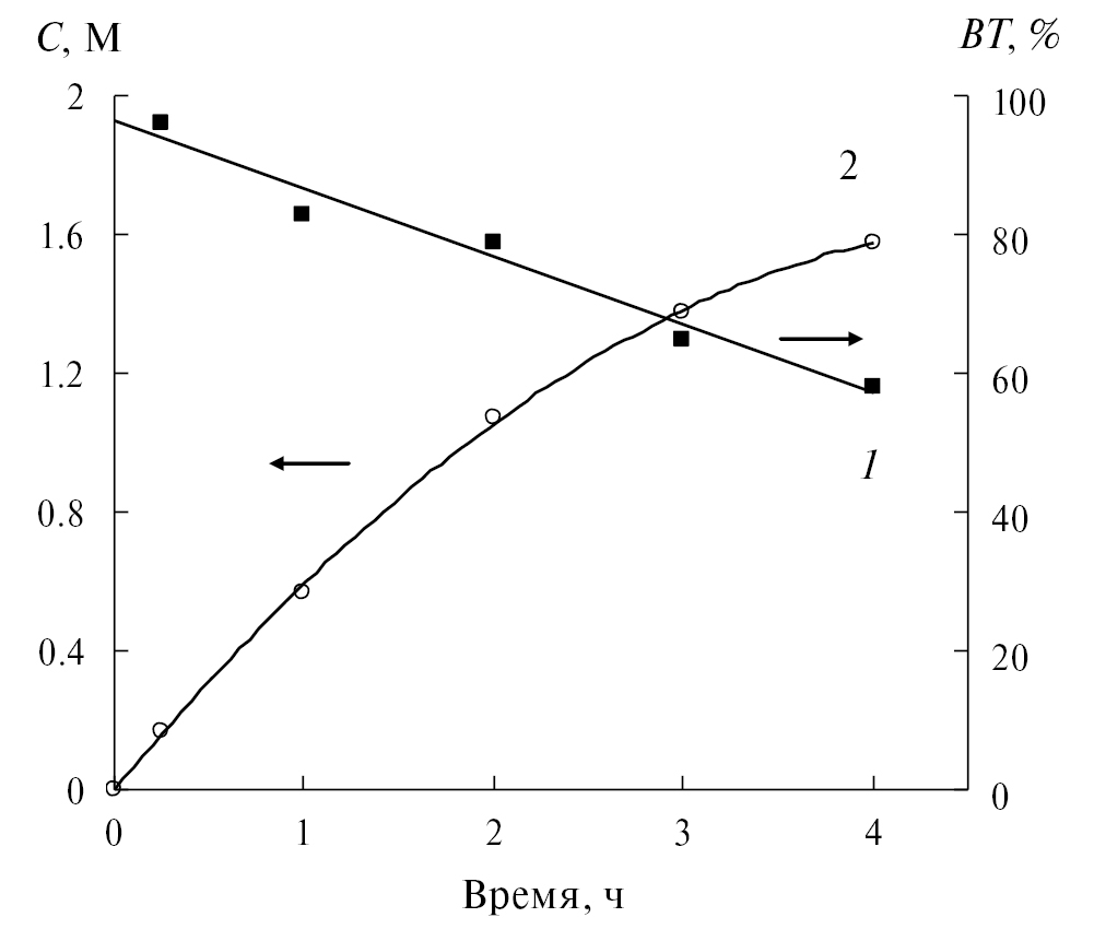 Рис. 3. Влияние времени электролиза на ВТ (1) и концентрацию формиата (2) в католите. Плотность тока – 190 мА/см2. Условия эксперимента приведены в таблице 1.