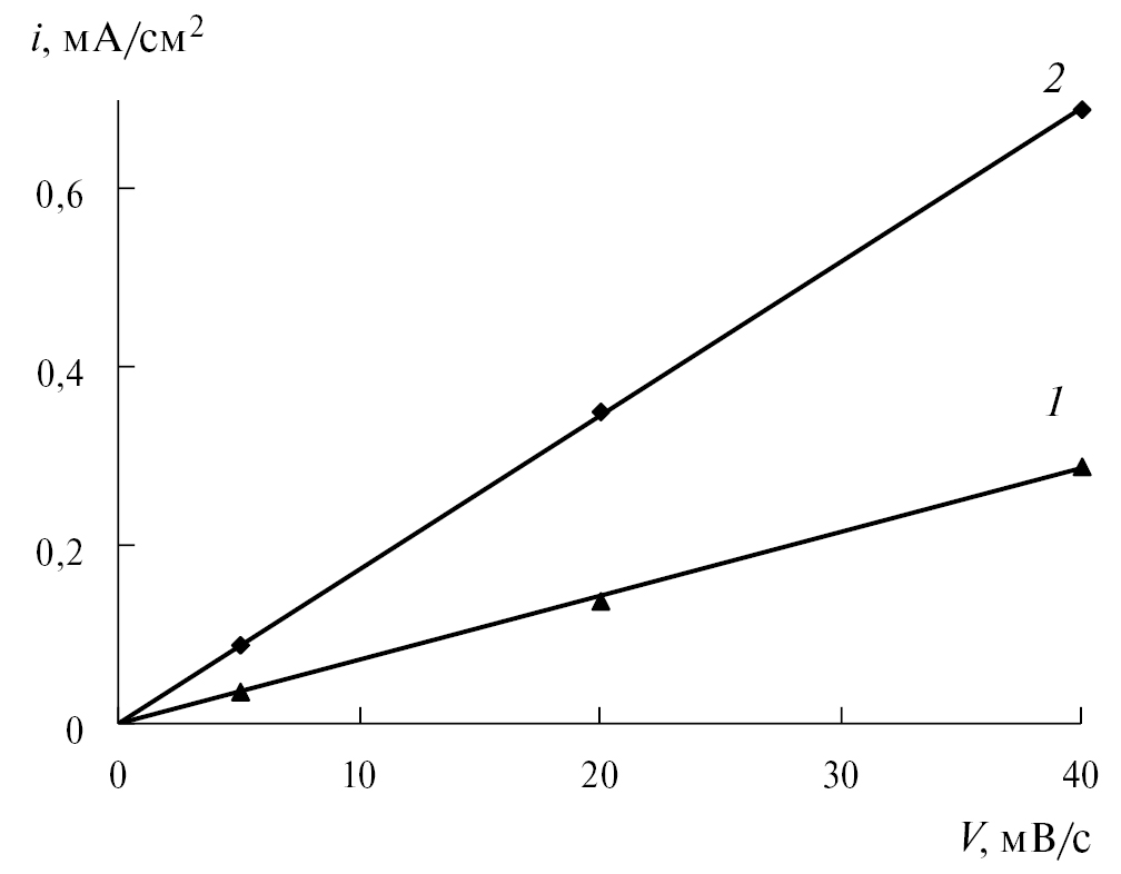Рис. 4. Зависимость плотности тока заряжения двойного слоя от скорости развертки потенциала. 1 – в начале эксперимента, 2 – после 4 ч электролиза.