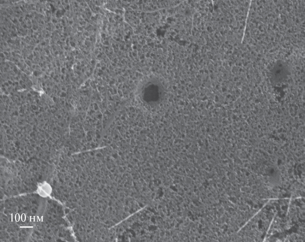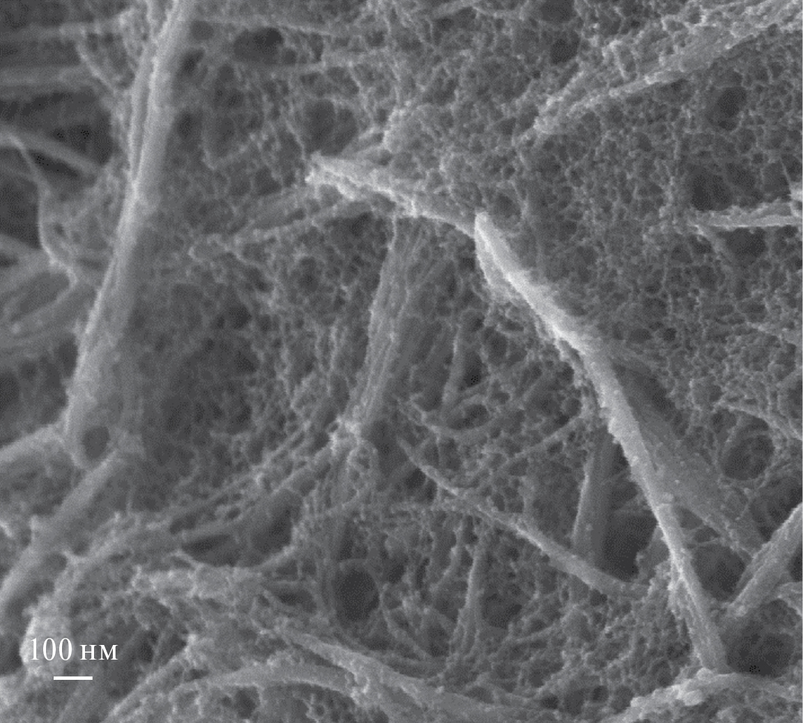 На рис. 2 показан вид нанокомпозитной бумаги после карбонизации в сканирующем электронном микроскопе (СЭМ). Углеродные нанотрубки покрыты сферическими глобулами карбонизованного резорцин-формальдегидного ксерогеля (C-ксерогеля). Межтрубное пространство также заполнено сеткой C-ксерогеля.
