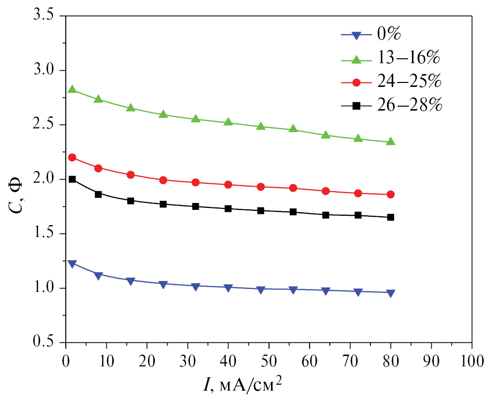 Емкость конденсатора измерялась гальваностатическим разрядом при постоянном токе, что наиболее близко соответствует условиям практического применения силовых суперконденсаторов [7], и рассчитывалась по следующей формуле: