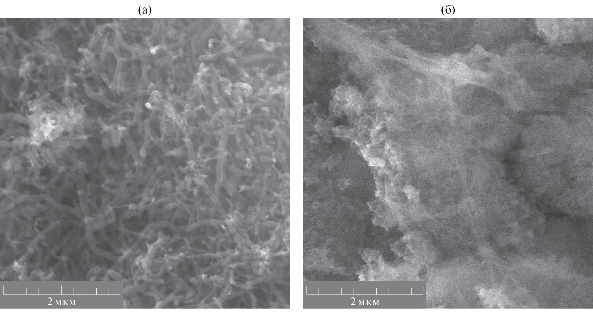 В работе использовали многослойные углеродные нанотрубки с внешним диаметром от 50 нм до 70 нм и длиной до 5 мкм (рис. 2а). Удельная площадь поверхности УНТ в исходном состоянии составила 109.6 м2/г, что свидетельствует о развитой поверхности материала.