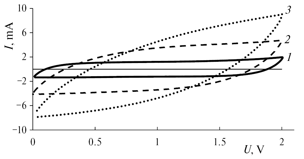 Циклические вольтамперограммы снимали в режиме двухэлектродной ячейки при скоростях изменения потенциала 3, 10, 25 мВ/с в диапазоне напряжений от 0 до 2 В.