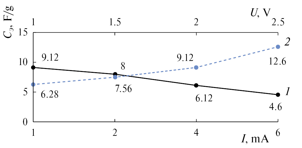 Рис. 5. Зависимость удельной емкости электрода из УНТ от увеличения тока заряда-разряда в диапазоне напряжений от 0 до 2 В (1) и от приложенного напряжения при токе Iз–р = 1 мА (2).