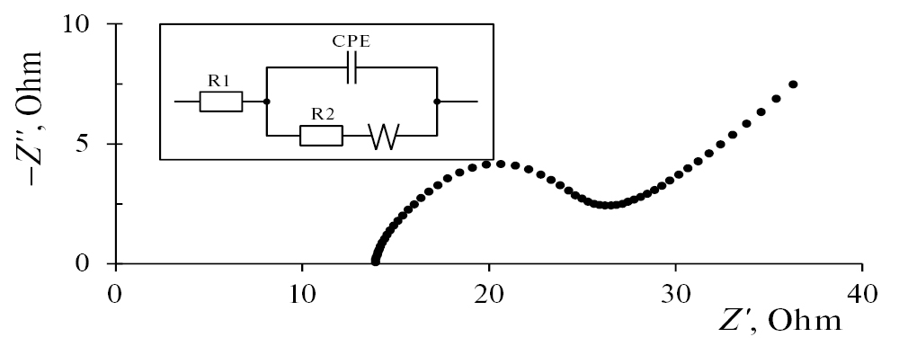 Полученный спектр был проанализирован с использованием электрической эквивалентной схемы Рэндлса (врезка на рис. 6). Сопротивление R1 соответствует эквивалентному последовательному сопротивлению контактов ячейки, сопротивление R2 соответствует сопротивлению переноса заряда в двойном электрическом слое, представленном элементом CPE. Значения R1 и R2 составляют 14 и 13 Ом соответственно.