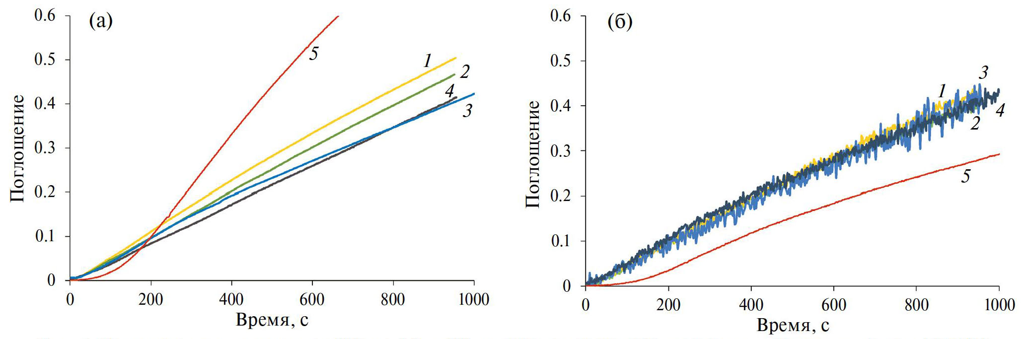 Рис. 5. Изменение поглощения на 700 нм (а) и 400 нм (б) в процессе ГС-осаждения гибридных пленок ПЭДОТ в присутствии NaFl при концентрациях, М: 0.00017 (1), 0.00034 (2), 0.00067 (3), 0.0014 (4), и в 0.1 М водном растворе NaClO4 (5).