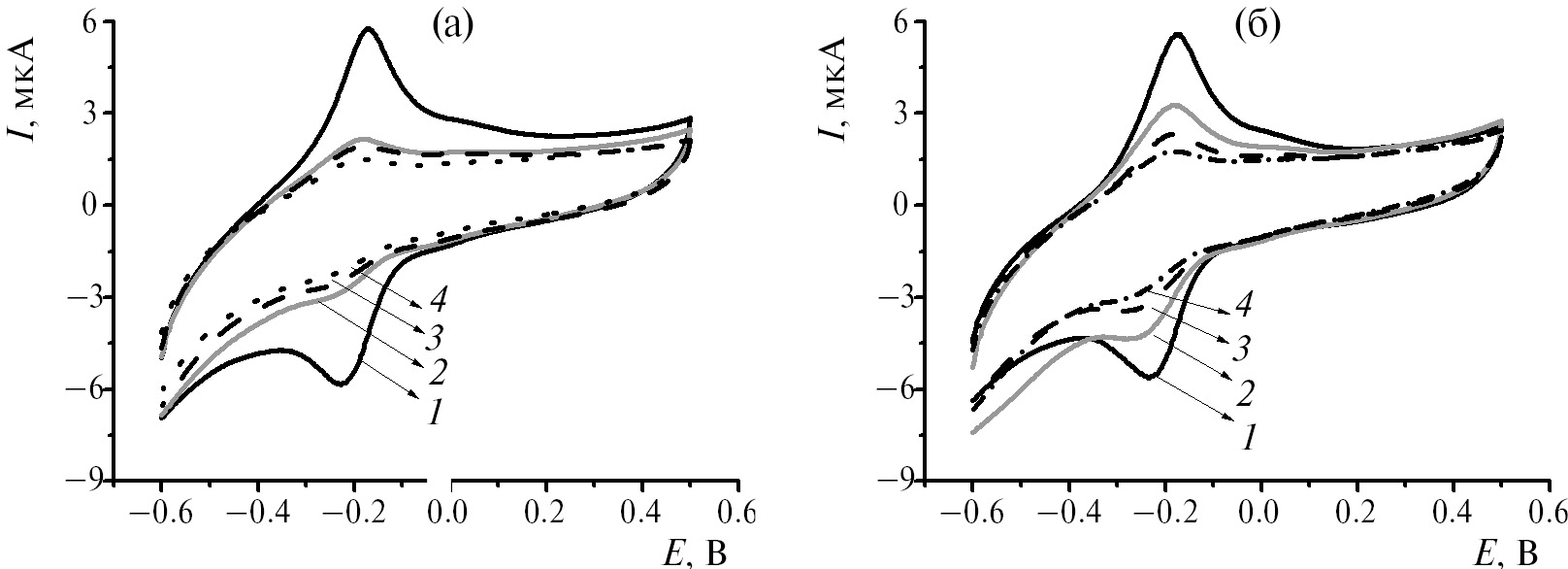 Рис. 3. Циклические вольтамперограммы, полученные на СУЭ с Азуром С, адсорбированным из ФБ, при иммобилизации нативной (а) и денатурированной (б) ДНК в концентрации, мг/мл: 1 – 0, 2 – 0.25, 3 – 0.5 мг, 4 – 1.0. 0.1 М ФБ, рН 7.0, диапазон сканирования потенциала –0.6 … 0.5 В, 0.1 В/с.