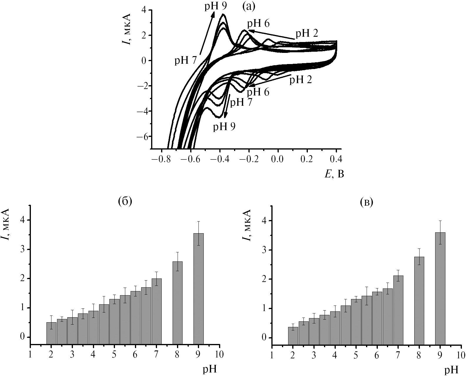 Циклические вольтамперограммы для указанных вариантов регистрации рН-зависимости представлены на рис. 2а и 2б. Токи пиков красителя увеличивались с рН в диапазоне 4.0–9.0 для обоих вариантов регистрации рН-зависимости (рис. 2в, 2г).