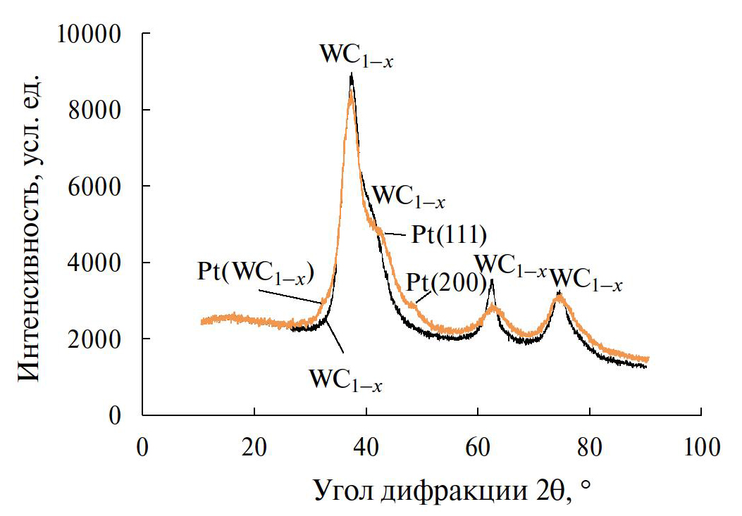 Альтернативой турбостратному углероду могли бы быть двумерные углеродные материалы на основе графена [18, 19], однако их синтез сложен и включает несколько стадий. Неуглеродные носители катализаторов в основном представлены оксидами и карбидами металлов [20, 21]; также перспективно использование нитридов [22]. Высокая каталитическая активность композитов, содержащих карбид переходного металла и платину, во многом определяется подобием электронной структуры и, в частности, плотности d-электронных состояний карбида переходного металла и платины [23]. Карбид вольфрама WC, обладающий высокими каталитической активностью и коррозионной устойчивостью [24–27], считается одним из наиболее перспективных носителей для электрокатализаторов РВВ.