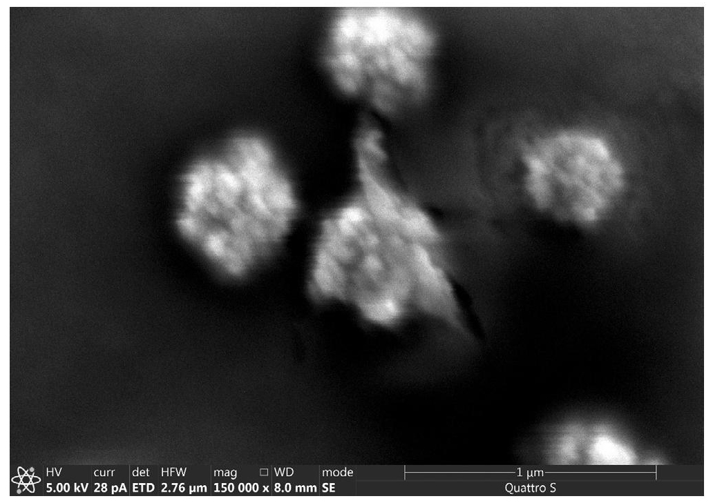 Рис. 3. Частицы платины на поверхности WC1–x/Cu-электрода, полученного методом осаждения платины в условиях отсутствия внешней поляризации. Время бестокового осаждения – 10 мин.