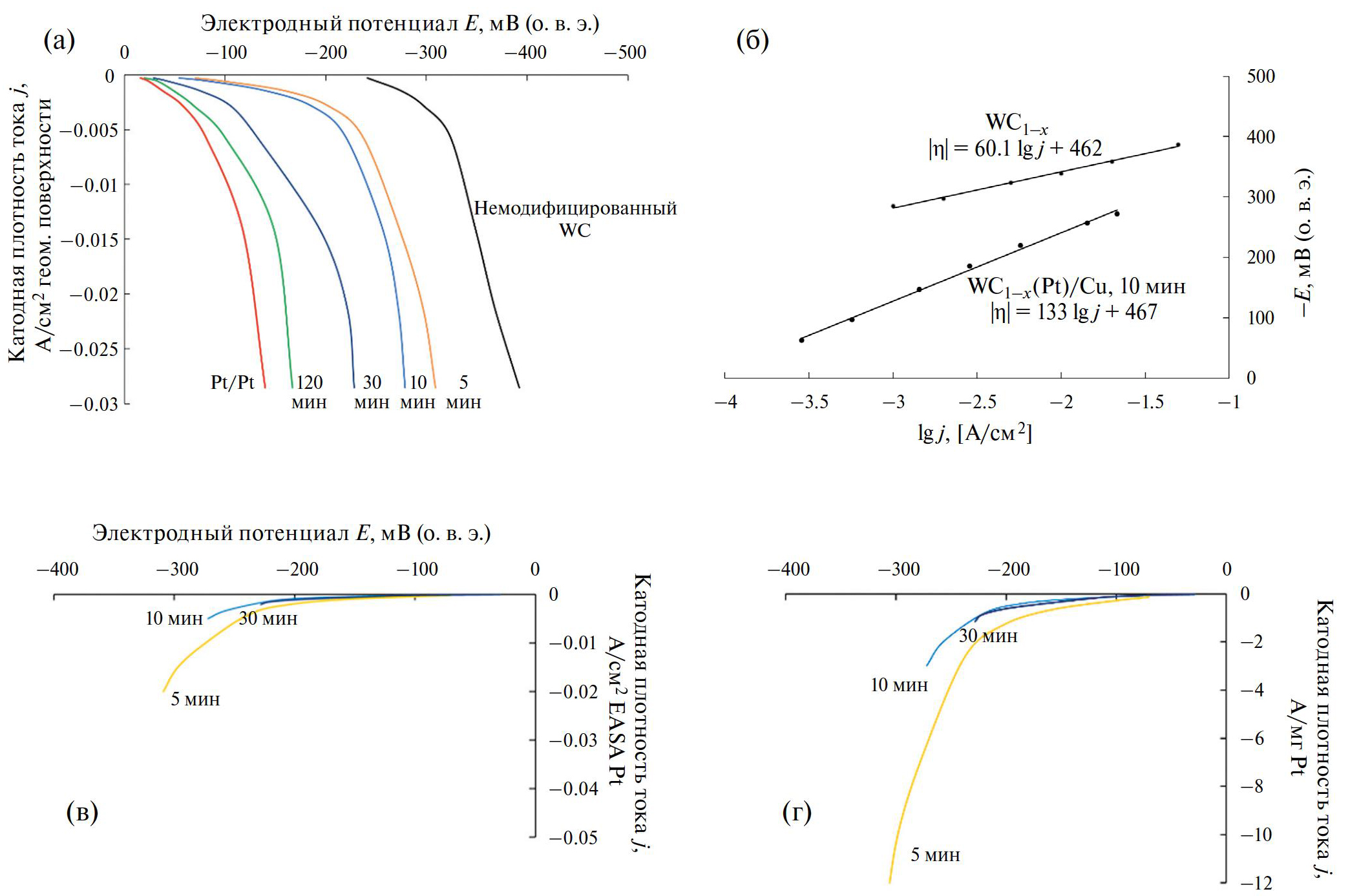 Электрокаталитическую активность Pt(WC1–x)/Cu-электродов в реакции выделения водорода определяли в 0.5 М растворе серной кислоты в потенциостатических условиях; в качестве ее критерия использовалась величина катодной плотности тока при данном потенциале, которая была отнесена к геометрической площади поверхности электрода, EASA (Pt) и массе платины. Потенциал рабочего электрода задавали относительно обратимого водородного электрода в том же растворе. За критерий стационарности принимали изменение тока, протекающего через исследуемый электрод, менее чем на 2% за минуту. Для оценки возможности практического применения разработанных электродов важна стабильность их работы в гальваностатических условиях в течение длительного времени. По этой причине ряд экспериментов был проведен в гальваностатических условиях.