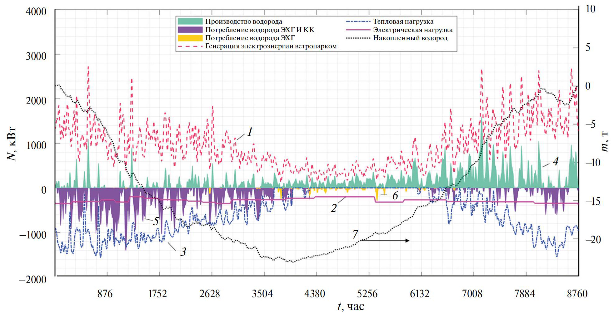 Рис. 6. Годовые графики альтернативной схемы энергоснабжения с. Новиково (о. Сахалин). 1 – генерация электрической энергии ветропарком; 2 – электрическая нагрузка; 3 – тепловая нагрузка; 4 – производство водорода; 5 – потребление водорода ТЭ и КК; 6 – потребление водорода ТЭ; 7 – накопленный водород.