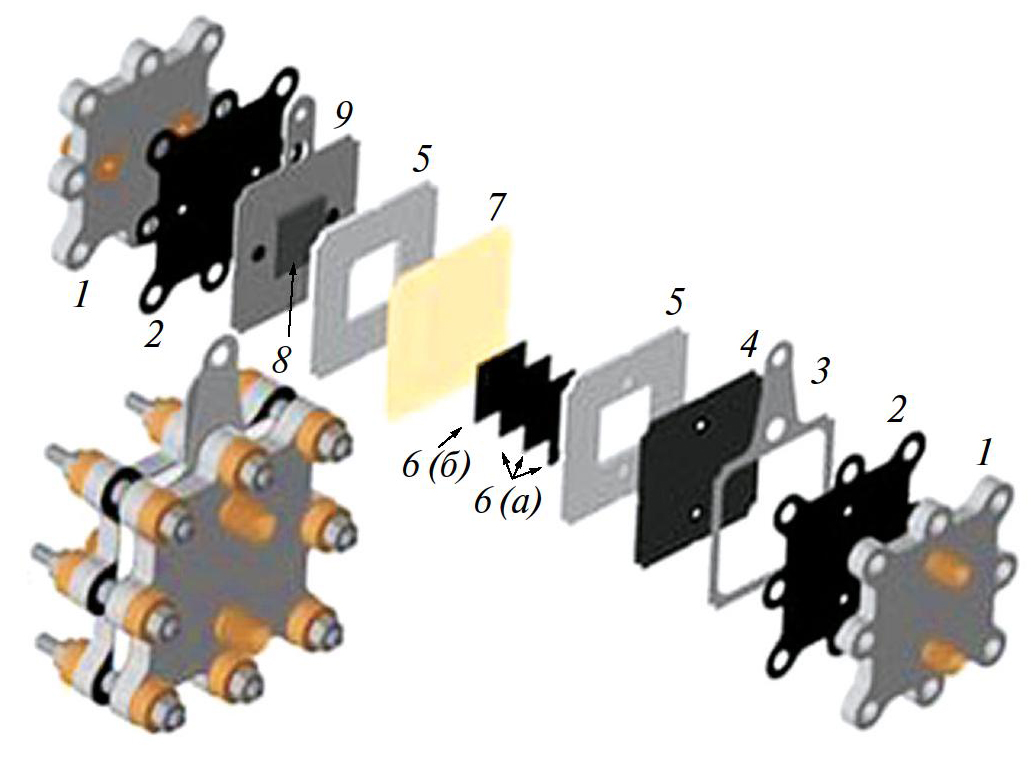 Рис. 1. Конструкция ячейки H2–Br2 батареи: 1 – металлические концевые пластины с компрессионными фитингами; 2 – уплотнительные прокладки; 3 – токосъемная пластина из титановой фольги; 4 – биполярная пластина из графлекса с уплотняющими кольцами; 5 – проточные поля типа “серпантин”; 6а – электроды из углеродной бумаги Sigracet 39 AA; 6б – углеродная бумага Freudenberg H23C8 (загрузка Pt/C 1 мг/см2); 7 – катион-проводящая мембрана; 8 – IrO2 /TiO2 /Ti-электрод; 9 – титановый токосъемник.