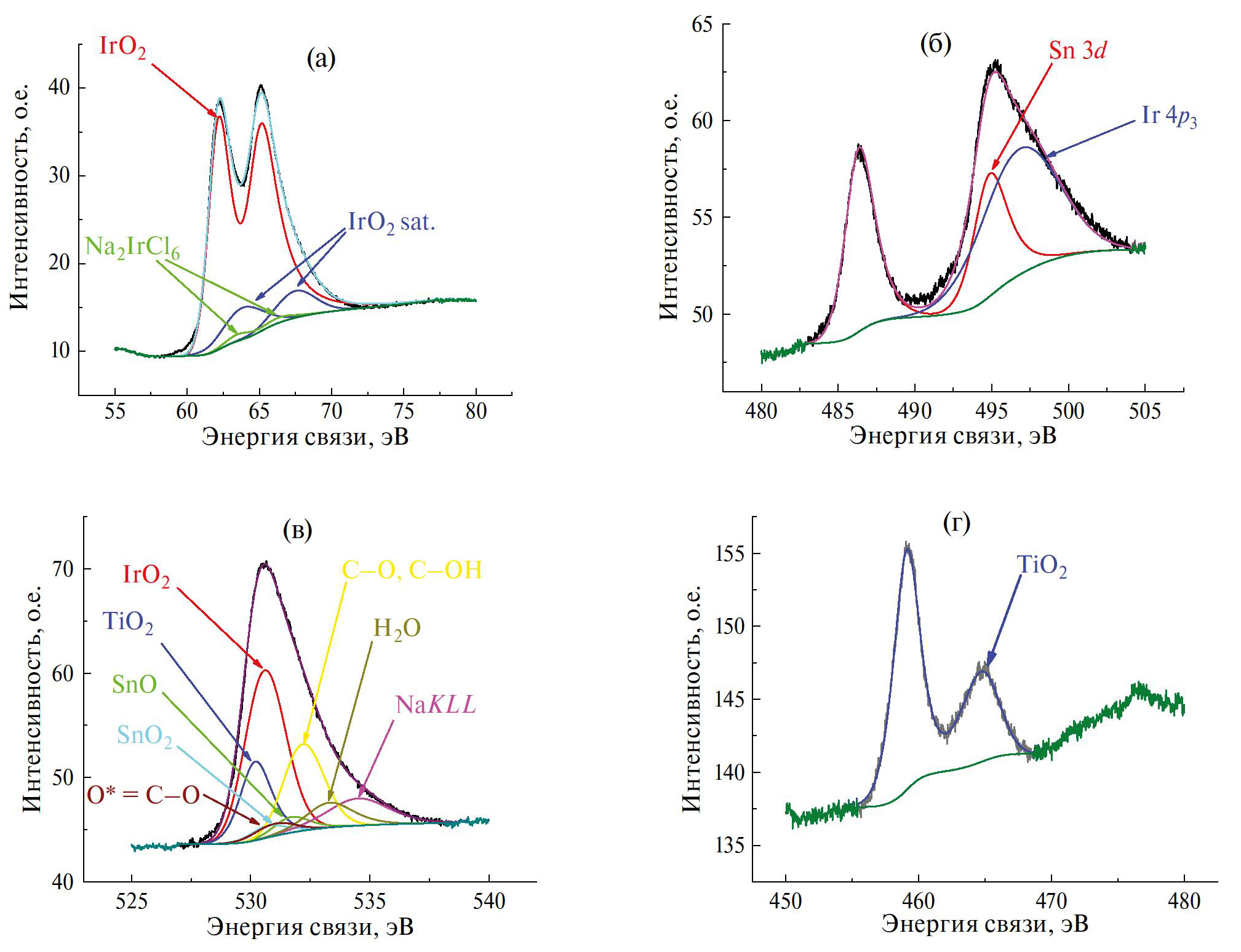 Рис. 3. РФЭС-спектры высокого разрешения: Ir 4 f (а) Sn 3d (б), O 1s (в), Ti 2p (г) электронных уровней IrO2 /TiO2 /Ti-электрода.