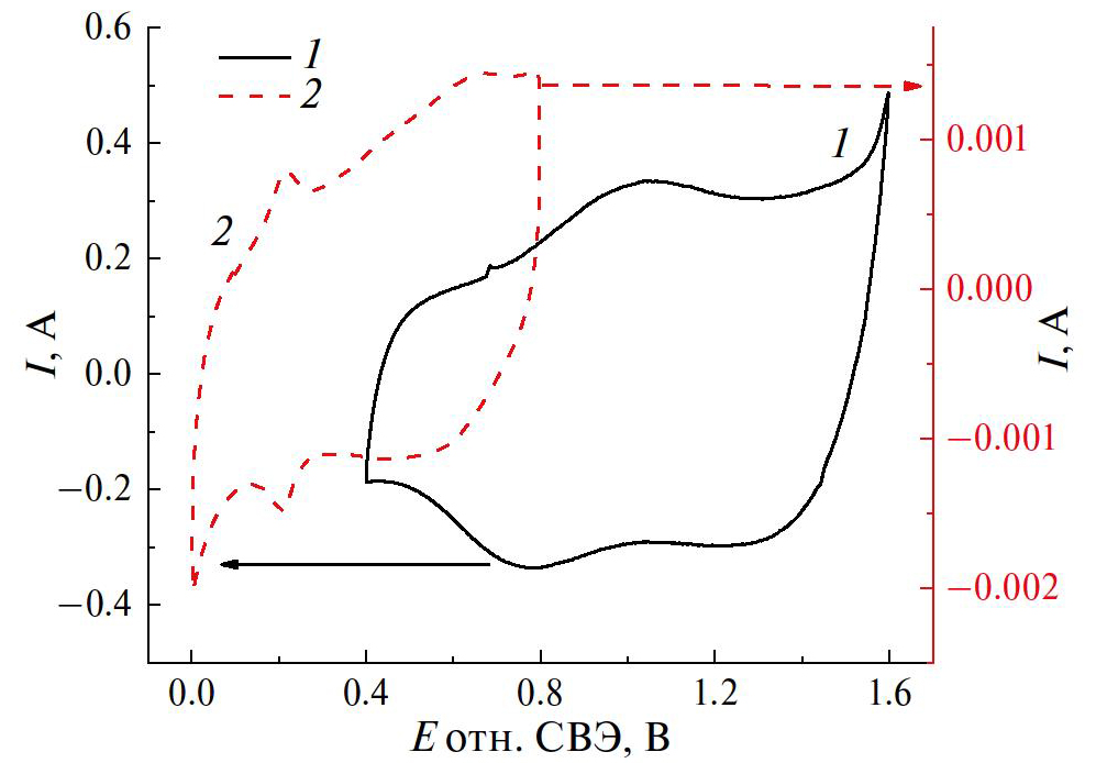 Рис. 5. ЦВА ячейки с различными материалами катода при пропускании через него фонового раствора 3 M H2SO4: 1 – IrO2/TiO2/Ti-электрод, 2 – углеродная бумага Sigraset 39AA. Скорость развертки потенциала – 20 мВ/с, 3-й цикл, подача водорода на анод – 0.5 л/ч.