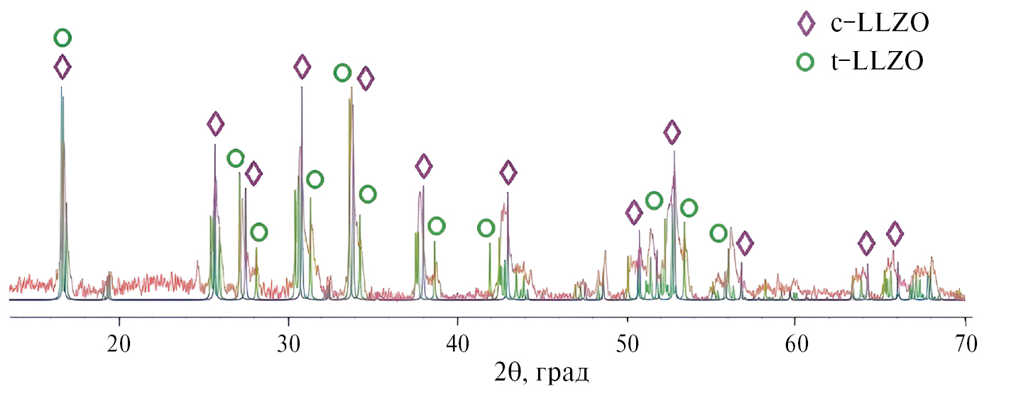 Синтезированные твердые электролиты Al–LLZO и Ta–LLZO характеризовали методами рентгенофазового анализа (РФА), энергодисперсионной рентгеновской спектроскопии (ЭДС), импедансной спектроскопии. Фазовый анализ проводили с использованием дифрактометра XRD-6000 и Rigaku MiniFlex-600, CuKα-излучение, интервал углов рассеяния 2q = 10–70°. Обработку данных методом Ритвельда (уточнение параметров решетки) выполняли с помощью ПО “SmartLab Studio II”, входящего в комплект поставки дифрактометра Rigaku MiniFlex-600. Для расшифровки дифрактограмм применяли международную базу данных ICDD PDF-4.
