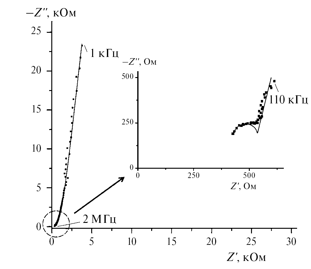 Ионную проводимость (s) изучали методом спектроскопии электрохимического импеданса [29] с амплитудой переменного сигнала 0.1 В импедансметром Z-2000 (Elins). Измерения проводили по двухэлектродной схеме в экранированной ячейке зажимной конструкции с графитовыми электродами. Частотный интервал измерений составил 102–2×106 Гц. Удельную ионную проводимость (stotal) рассчитывали с учетом геометрических размеров по формуле