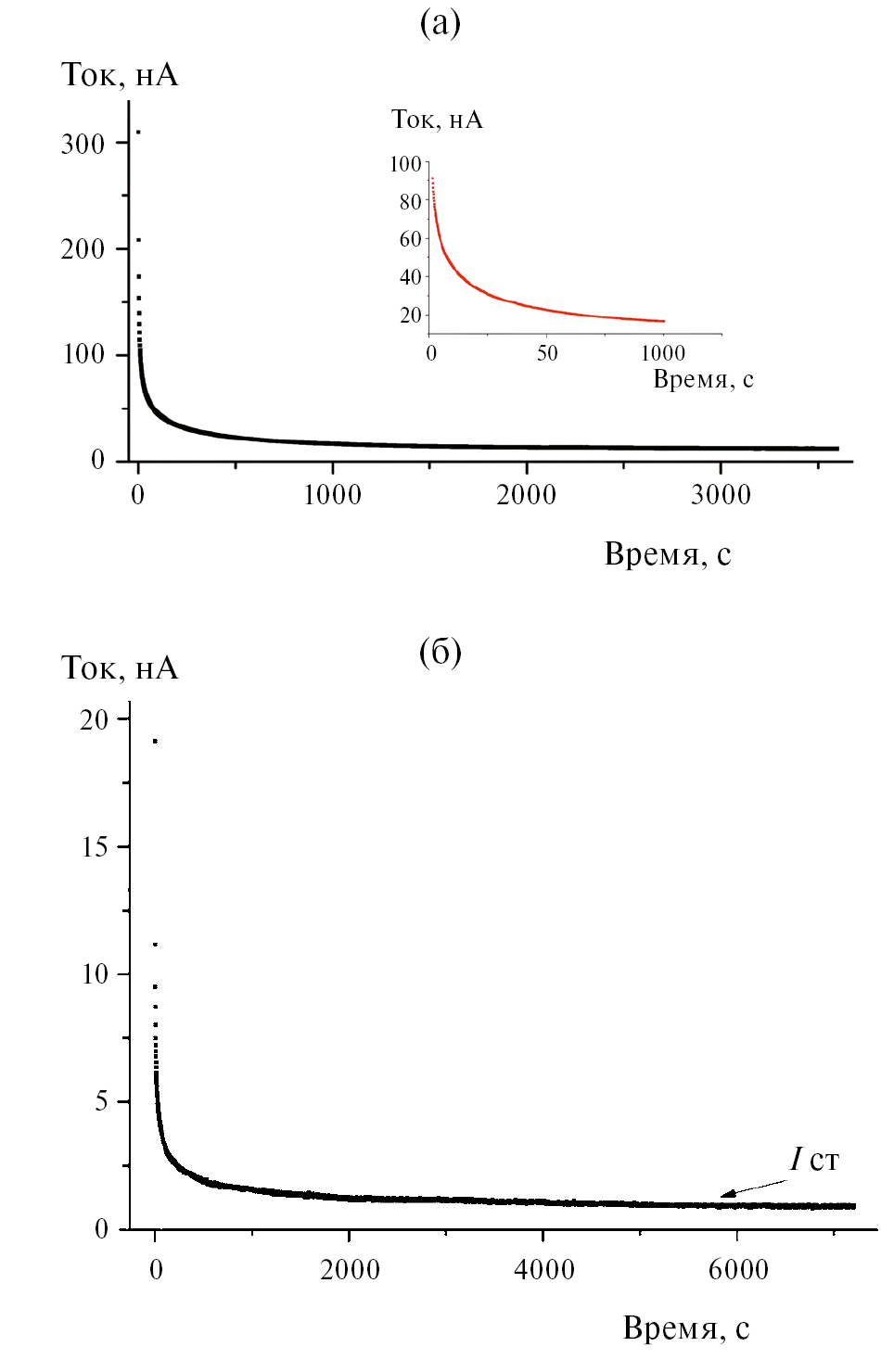 Рис. 6. Хроноамперометрические кривые для Ta–LLZO после твердофазного спекания (а) и после ИПС (б).