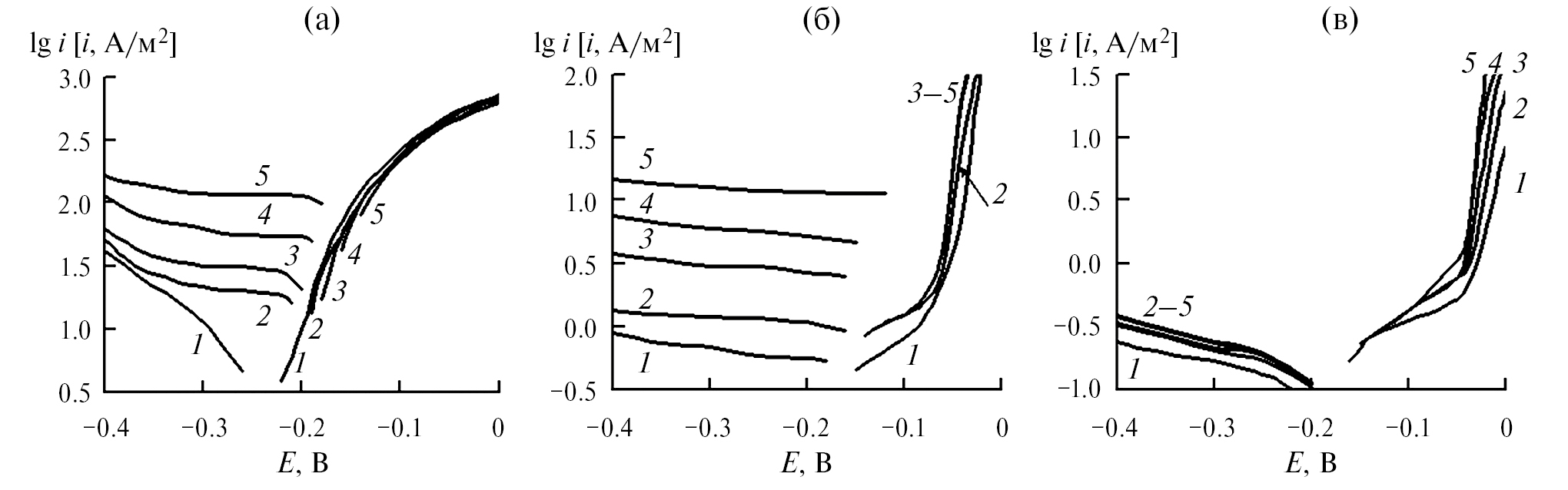 Рис. 1. Поляризационные кривые стали Ст3 в 2 M H3PO4 (а) с добавками 0.5 мМ ИФХАН-92 + 0.5 мМ KNCS (б) и 5 мМ ИФХАН-92 + 0.5 мМ KNCS (в), содержащей FePO4, М: 1 – 0; 2 – 0.01; 3 – 0.02; 4 – 0.05; 5 – 0.10. Значение n = 460 об/мин; t = 25°C.
