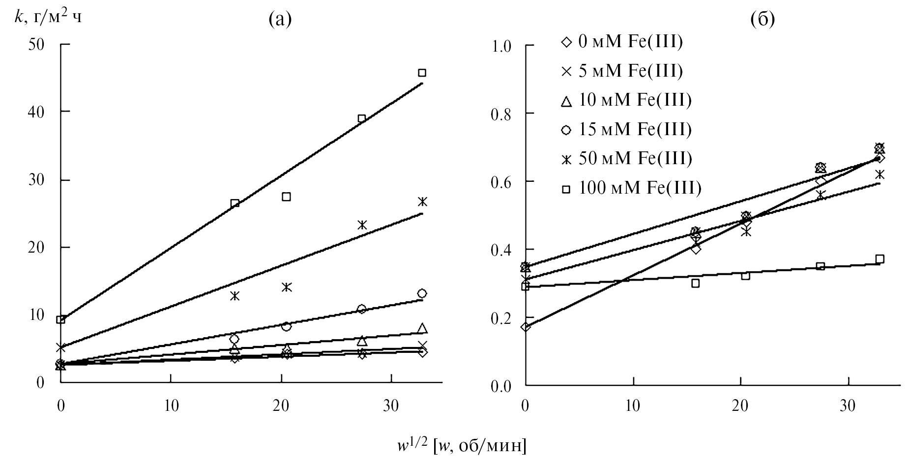 Таблица 2. Значения постоянных ik и f в уравнении (14) при Е = –0.30 В для катодной реакции стального вращающегося дискового электрода в 2 M H3PO4, содержащей FePO4. Значения ik – в А/м2, f – в А мин1/2/(м2 об1/2), t = 25°C