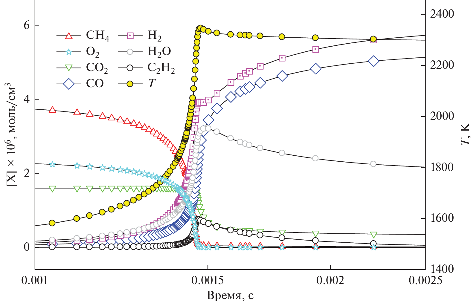 Проведен кинетический анализ некаталитического углекислотного риформинга СН4 в диапазоне температур 1500–1800 К в условиях непостоянной температуры за фронтом отраженной ударной волны. Установлены стадии превращения метана в синтез-газ, соответствующие этим стадиям характерные интервалы времени и наиболее важные элементарные реакции. На первой стадии молекулы метана в результате термического пиролиза последовательно превращаются в этан, этилен, а затем самый стабильный в данном интервале температур ацетилен. На второй стадии ацетилен превращается в СО и Н2, а для богатых смесей – и в частицы сажи. Конверсия СО2 протекает на второй и третьей стадиях, когда практически завершается конверсия СН4. Она происходит в результате взаимодействия молекул СО2 с появившимися в реагирующей системе атомами Н● и приводит к образованию молекул СО и радикалов ОН●. Ацетилен расходуется преимущественно в реакции с радикалами ОН●. Высокая концентрация ацетилена при риформинге метана способствует интенсивному формированию зародышей сажи, для которых ацетилен дает максимальный вклад в скорость их поверхностного роста. При этом сам ацетилен не является предшественником зародышей частиц сажи, которые преимущественно возникают из радикалов \({{{\text{{С}}}}_{{\text{3}}}}{\text{{Н}}}_{3}^{\centerdot }\).