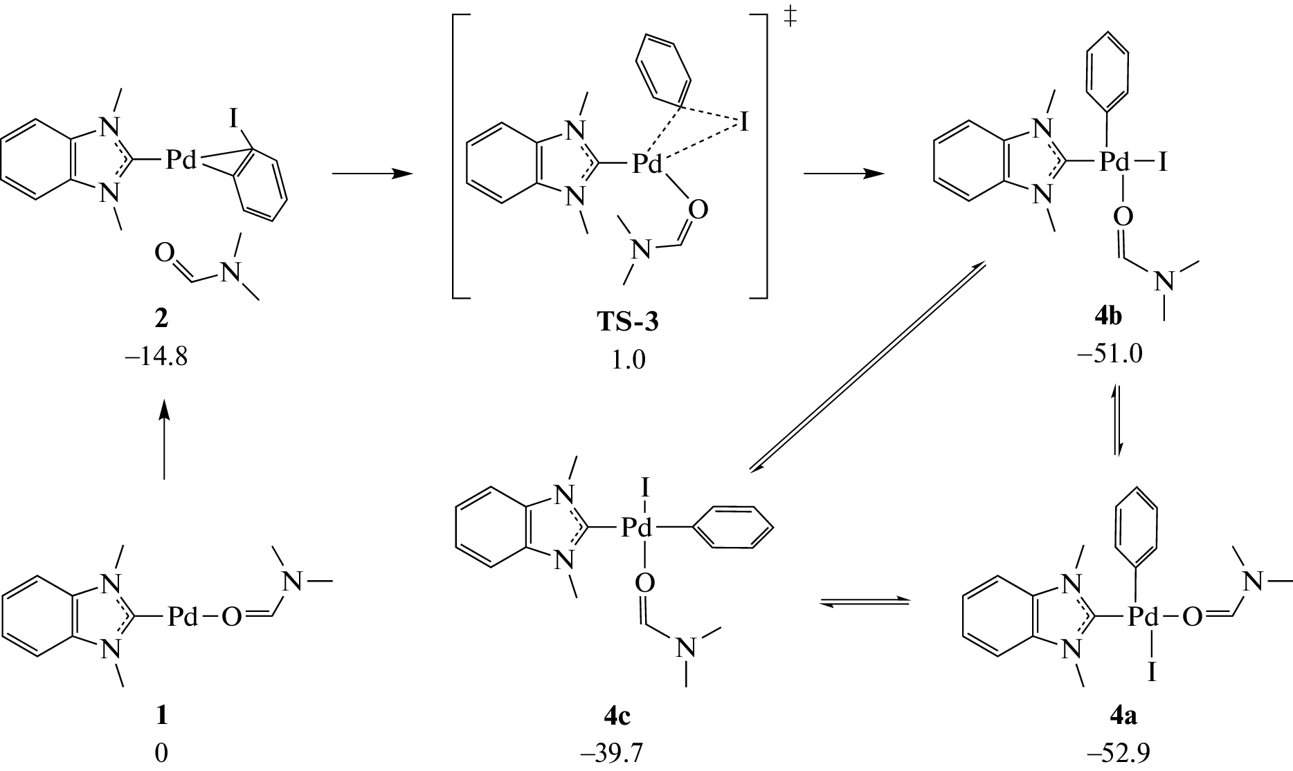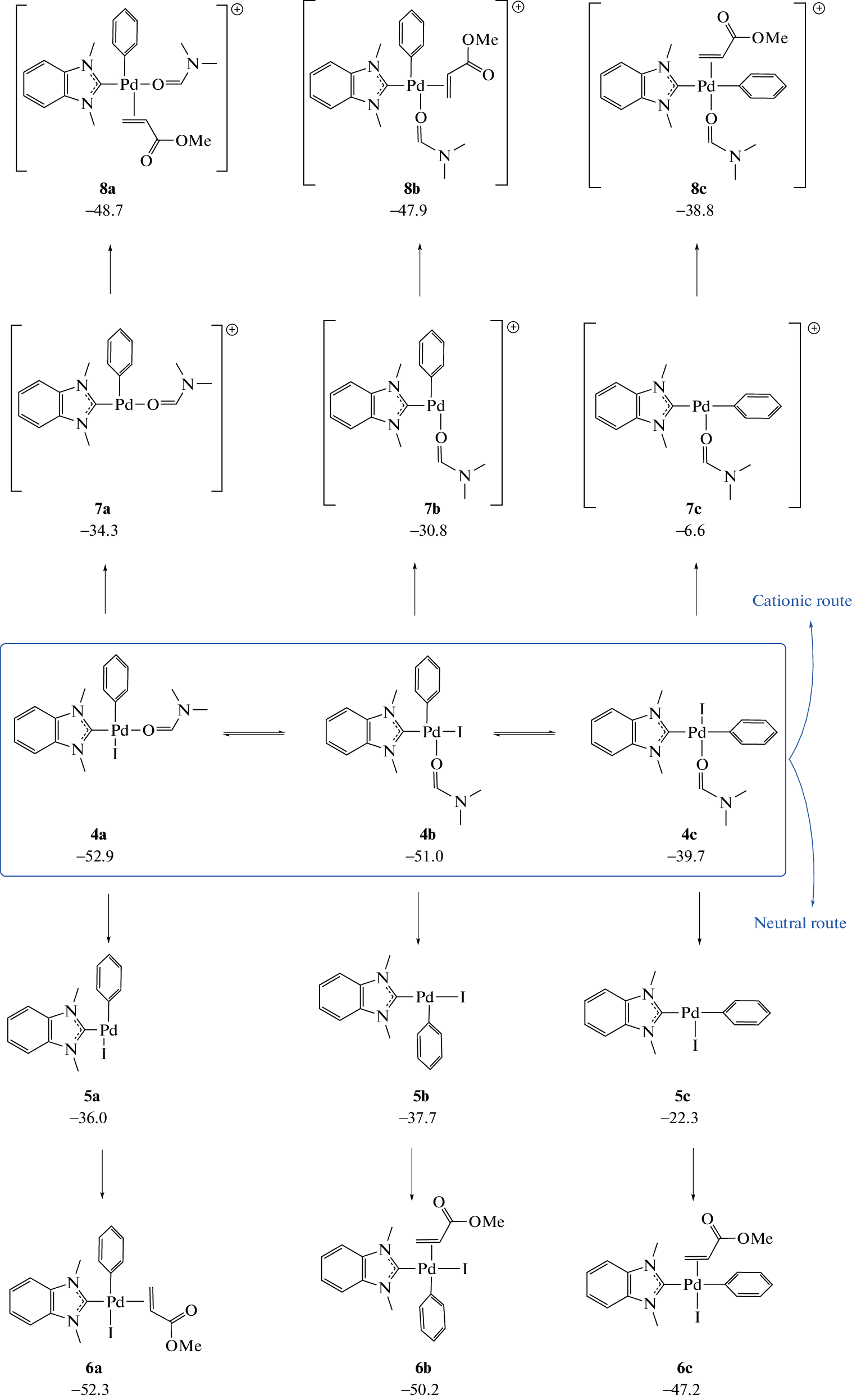 The mechanism of the formation of catalytic species in the practically important Mizoroki–Heck reaction, which is in demand in modern fine organic synthesis, has been studied. It has been shown that catalysts based on palladium complexes with N-heterocyclic carbene ligands are transformed into a “ligand-free” form under the conditions of the Mizoroki–Heck reaction. Molecular modeling performed using quantum chemical methods showed that these processes compete with the target reaction at three of the six stages of the catalytic cycle. The presence of catalyst transformation products in the reaction system was confirmed by methods of nuclear magnetic resonance and mass spectrometry. Important mechanistic data have been obtained for the rational design of catalytic systems for cross-coupling reactions.