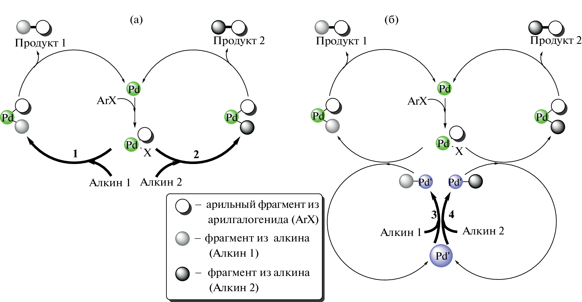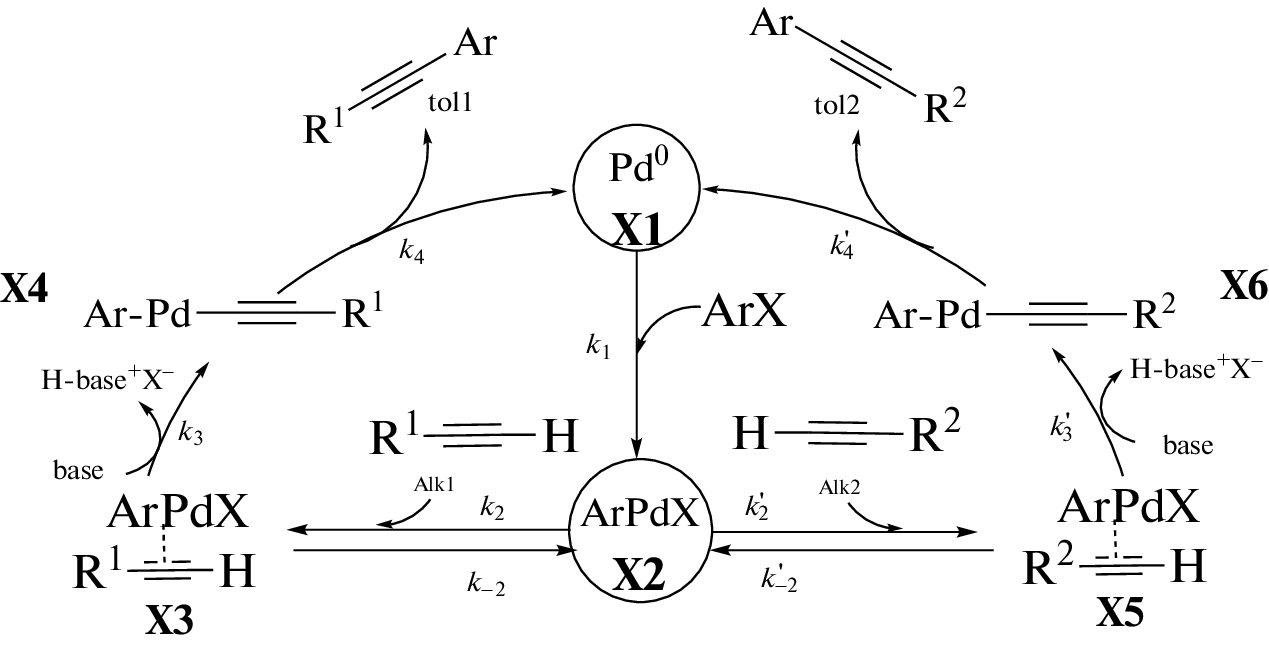 В работе представлены результаты сравнительного исследования дифференциальной селективности реакции Соногаширы с парой конкурирующих арилацетиленов в т.н. “безлигандных” “безмедных” условиях при варьировании природы и концентрации общих для конкурирующих субстратов арилгалогенидов и основания. Изменение величины дифференциальной селективности, обнаруженное при варьировании природы арилгалогенидов, согласуется с тем, что активация арилгалогенида и арилацетилена осуществляется последовательно по линейному с точки зрения химической кинетики механизму. Обнаруженное отсутствие влияния природы и концентрации основания на селективность реакции в условиях конкуренции арилацетиленов указывает на практически необратимую стадию их активации.