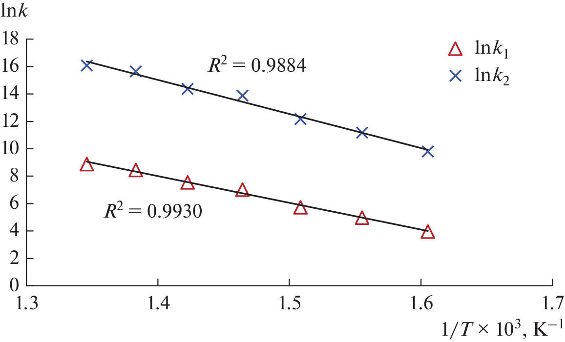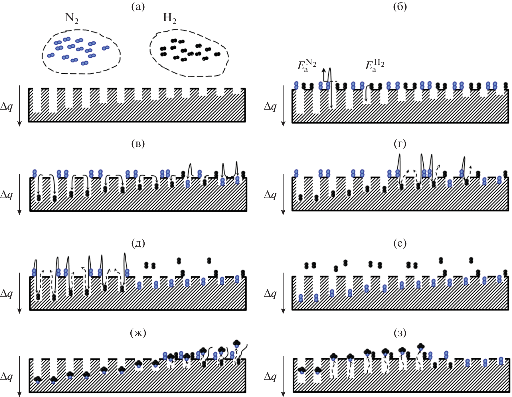 An analytical equation for the rate of formation/consumption of nitrogen in the reversible reaction N2 + + 3H2 ↔ 2NH3 was obtained on the base of the analysis of the catalytic properties of 4%Ru–13.6%Cs/Sibunit and 4%Ru–5.4%Ba–7.9%Cs/Sibunit in the processes of ammonia decomposition (105 Pa; 350–470°C) and synthesis ammonia (6×105–5×106 Pa; 400–430°C). This equation allows one to describe correctly the dependence of the chemical reaction rate on the partial pressures of the components of the reaction mixtures for both forward and reverse reactions. The approach used to obtain the kinetic equation is based on the assumption that the adsorption sites on the ruthenium surface are initially filled with hydrogen and then replaced by nitrogen during competitive interaction. The values of the equilibrium constants and apparent activation energies for the synthesis and decomposition of ammonia on the 4%Ru–13.6%Cs/Sibunit and 4%Ru–5.4%Ba–7.9%Cs/Sibunit was found by using the proposed kinetic equation. The data are in good agreement with the ones presented in the literature.