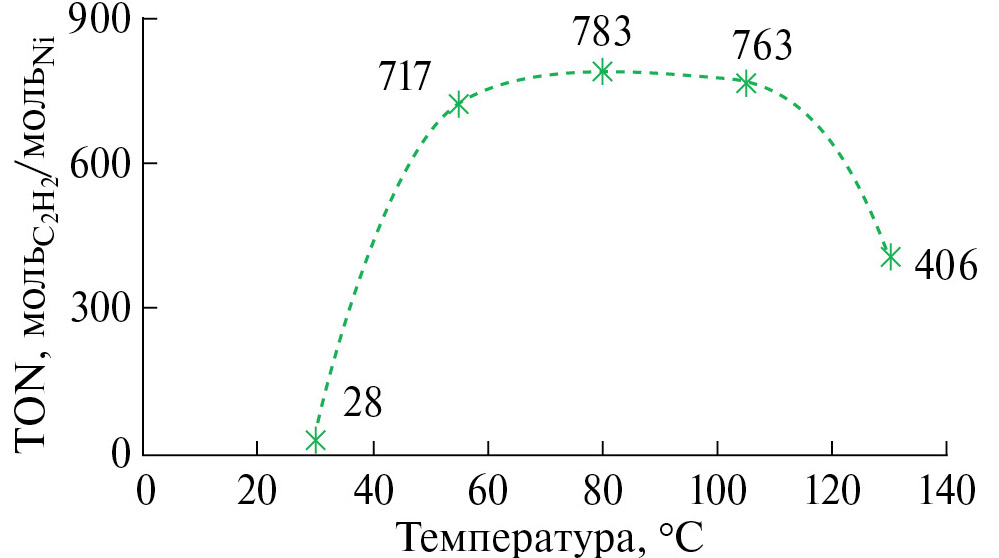 На рис. 3 показано влияние температуры на активность (TON) системы 1/Ni(COD)₂. Из рис. 3 следует, что данная зависимость носит экстремальный характер, максимальные значения TON наблюдаются в интервале 55–105°C. Наименьшие значения TON при Т = 30°C обусловлены тем, что этой температуры недостаточно для полной трансформации композиции 1/Ni(COD)₂ в металл-гидридный комплекс [12], который, согласно литературным данным, является активной формой катализатора в процессах гомогенной олигомеризации этилена, а снижение TON с 763 до 406 голиг/гNi с повышением температуры со 105 до 130°C (табл. 2), вероятнее всего, связано с возможным термическим разрушением активных металл-гидридных центров.