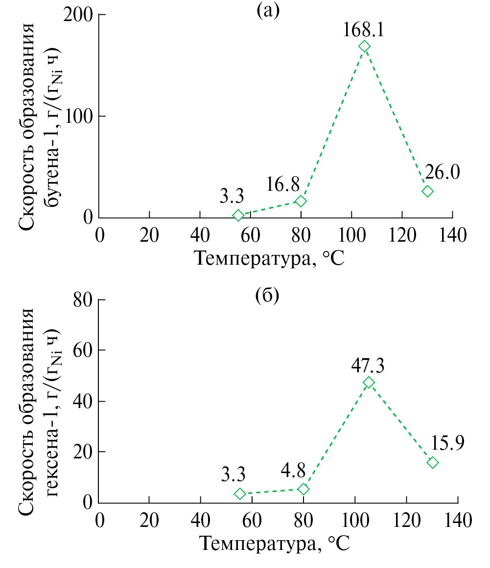 Необходимо отметить, что с повышением температуры до 105–130°C время снижения давления (т. е. длительность процесса олигомеризации) резко сокращается, что обусловлено ростом активности катализатора. Вследствие этого фактическое значение частоты оборотов TOF резко возрастает в 10 раз (с 52 до 509 мольС₂Н₄ мольNi⁻¹ч⁻¹) при нагреве от 80 до 105°C (табл. 2). Это эквивалентно отражается на скоростях образования бутена-1 и гексена-1, значения которых увеличиваются с 16.8 до 168.1 и с 4.6 до 47.3 голиг гNi⁻¹ч⁻¹, соответственно, (рис. 5).