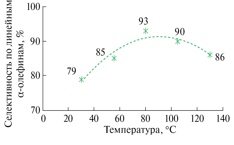 Селективность образования линейных α-олефинов также имеет экстремальную зависимость от температуры в интервале 30–130°C (рис. 6). Снижение этого показателя с повышением температуры олигомеризации от 80 до 130°C обусловлено возрастанием скорости процессов изомеризации олефинов и ее преобладанием над скоростью олигомеризации этилена.
