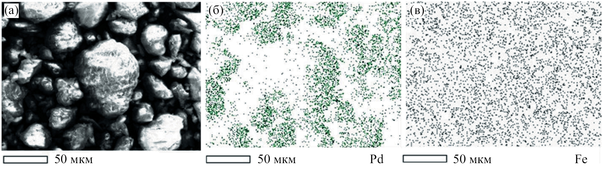 Рентгеновские фотоэлектронные спектры (РФЭС) регистрировали на спектрометре Axis Ultra DLD (“Kratos Analytical”, Великобритания), монохроматическое AlKα-излучение. Шкалу энергии спектрометра предварительно калибровали по энергиям связи линий Au4f7/2 (83.96 эВ), Ag3d5/2 (368.21 эВ) и Cu2p3/2 (932.62 эВ) чистых металлов. Спектры высокого разрешения регистрировали при энергии пропускания анализатора 40 эВ с применением нейтрализатора и калибровали по положению линии Al2p, принятому равным 74.6 эВ. Спектры Pd3d описывали с помощью синтетических компонент, соответствующих состояниям палладия Pd0 и Pd2+, а спектры Fe2p – с помощью компонент, соответствующих состояниям железа Fe0, Fe2+ и Fe3+, как это указано в работе [9]. Для описания спектров Pd3d образцов после каталитических испытаний использовали три дублета, соответствующих Pd0, PdO и PdCl2.
