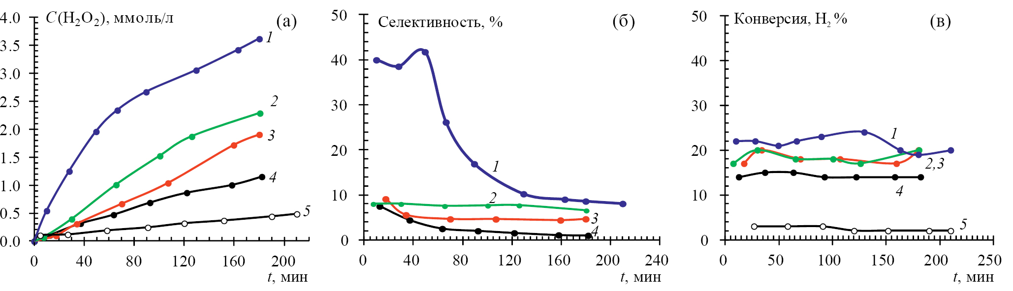 Общее количество потребленного водорода рассчитывали исходя из разности скоростей водорода на входе и выходе из реактора и времени. При расчете интегральной селективности по H2O2 предполагали, что в период между отборами газовых проб (15 мин) содержание газовой смеси на входе и выходе оставалось практически постоянным (но разным) из-за невысокой скорости процесса.