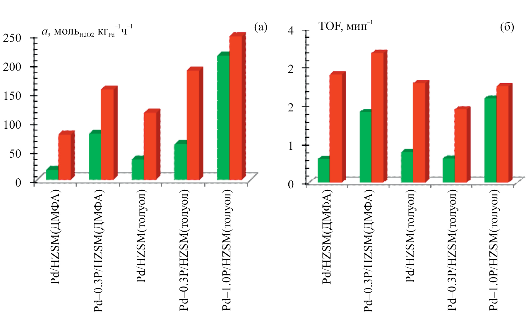 Природа растворителя, в котором проводится синтез, влияет не только на скорость процесса, но также на состав и седиментационную устойчивость Pd–P наночастиц. В отличие от ДМФА, в среде апротонных неполярных растворителей (бензол, толуол) в отсутствие стабилизаторов образующиеся Pd–P-наночастицы агрегируют и выпадают в осадок [24]. Учитывая эти данные, для исследования свойств Pd- и Pd–P-катализаторов, наносимых на цеолит НZSM-5, в прямом синтезе H2O2 была получена серия образцов при разном соотношении P : Pd в двух апротонных растворителях: ДМФА и толуоле. Результаты тестирования Pd- и Pd–P-катализаторов в прямом синтезе H2O2 в среде этанола в мягких условиях (Т = 10°С, Р = 1 атм) представлены на рис. 1.