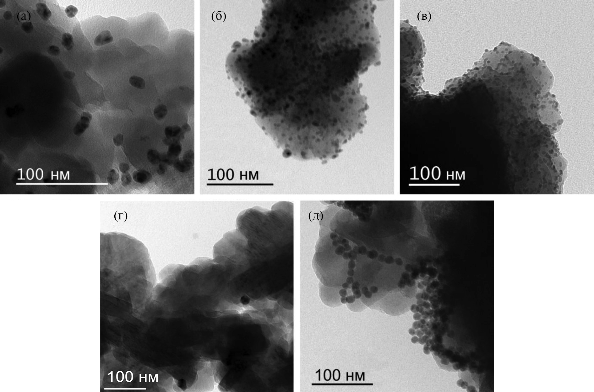 Рис. 3. ПЭМ-снимки катализаторов Pd/HZSM-5(толуол) (а), Pd–0.3Р/HZSM-5(толуол) (б), Pd–1.0Р/HZSM-5(толуол) (в), Pd–0.3Р/HZSM-5(ДМФА) (г) и Pd–0.3Р/HZSM-5(ДМФА) (д).