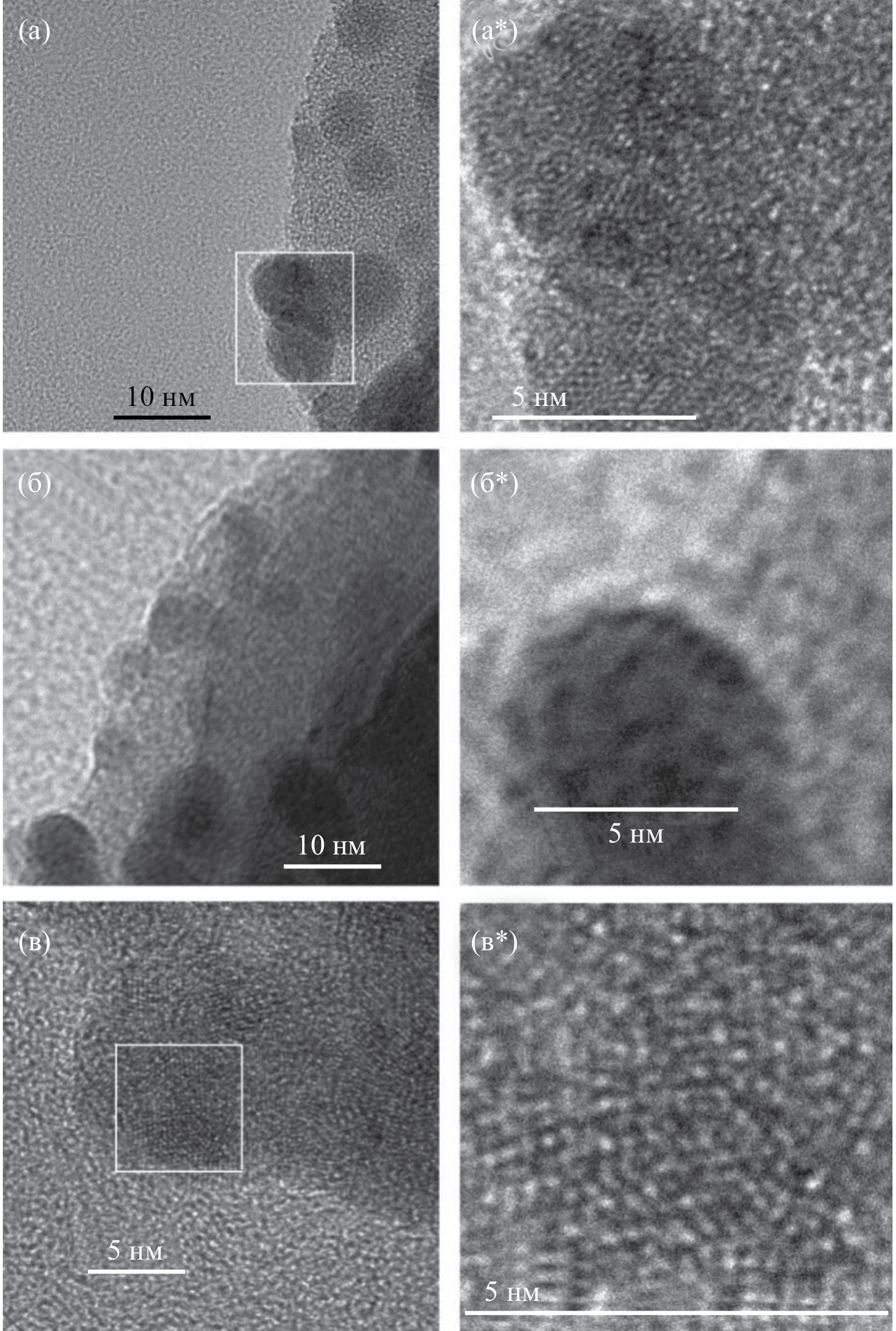 Рис. 4. ПЭМ-снимки высокого разрешения катализаторов Pd–0.3Р/HZSM5(толуол) (а), Pd–1.0Р/HZSM-5(толуол) (б), Pd–0.3Р/HZSM-5(ДМФА) (в).