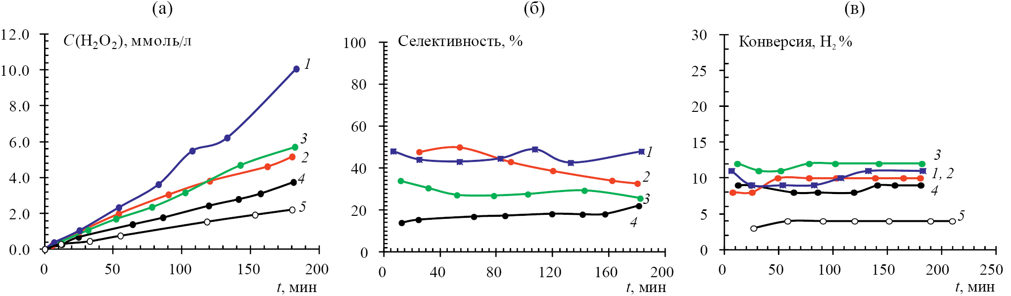 Рис. 5. Кинетические кривые накопления H2O2 (а), изменения селективности по H2O2 (б) и конверсии H2 (в) в мягких условиях в присутствии катализаторов Pd–1.0P/НZSM-5(толуол) (1), Pd–0.3P/НZSM-5(толуол) (2), Pd–0.3P/НZSM-5(ДМФА) (3), Pd/НZSM-5(толуол) (4), Pd/НZSM-5(ДМФА) (5). Условия процесс: ν(Pd) = 5 × 10–6 моль, Т = 10°С, Р = 1 атм, растворитель – этанол (40 мл) : раствор HCl (10 мл). Селективность в присутствии катализатора Pd/НZSM-5(ДМФА) не рассчитывали из-за низкой конверсии водорода.
