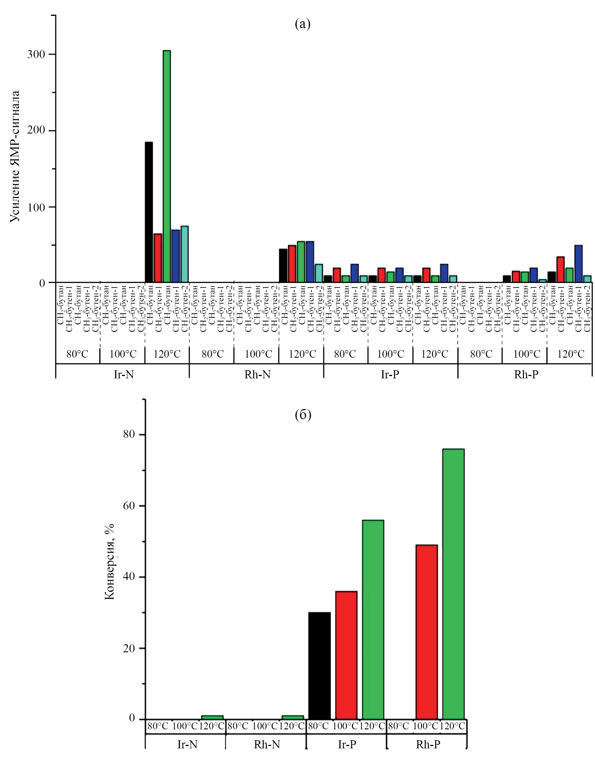 Рис. 1. Данные об усилении ЯМР-сигнала (а) и конверсии (б) в реакции гидрирования 1,3-бутадиена параводородом в присутствии исследуемых катализаторов.