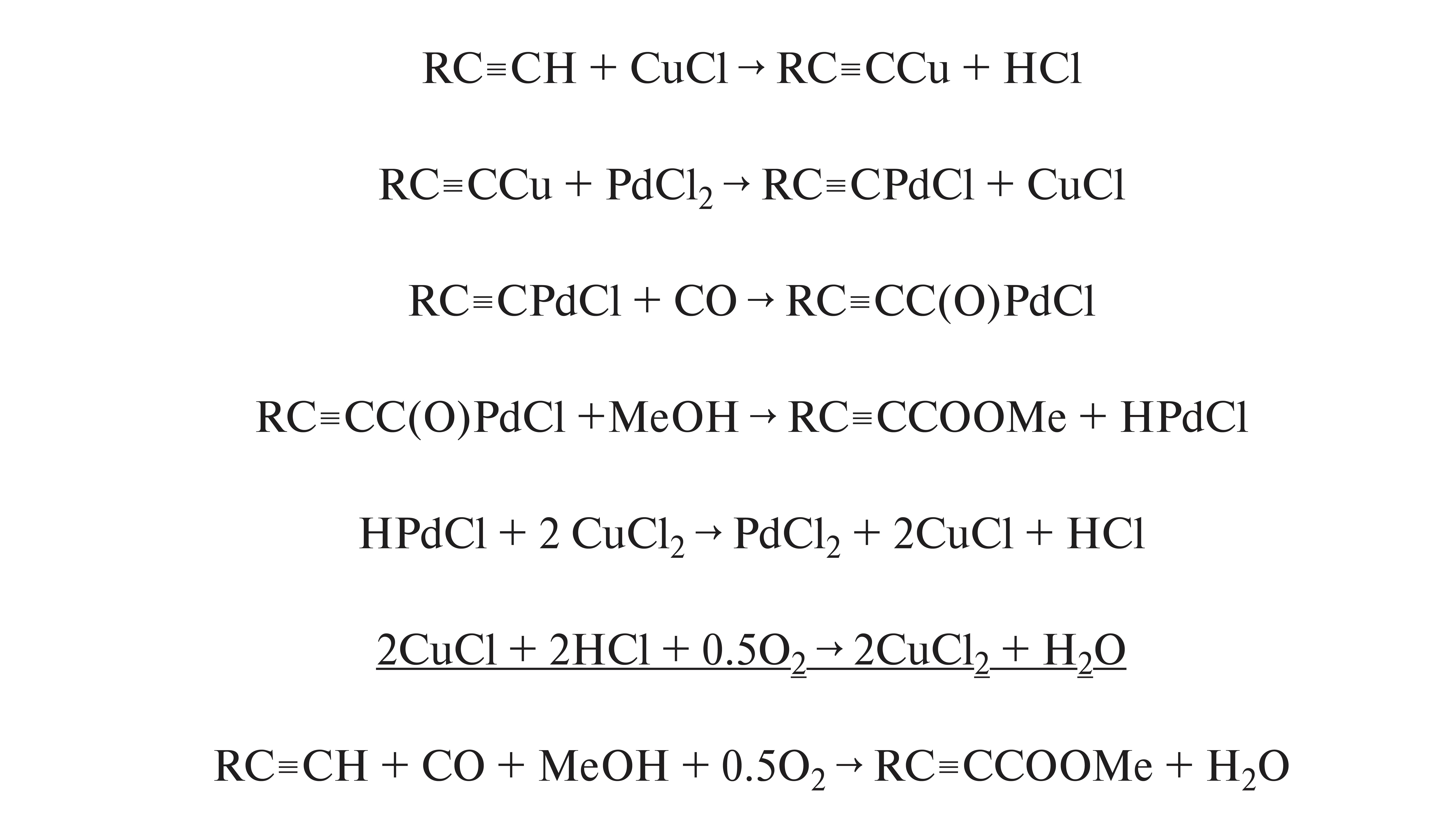 RC≡CH + CO + MeOH + 0.5O2 → RC≡CCOOMe + H2O (новая реакция).