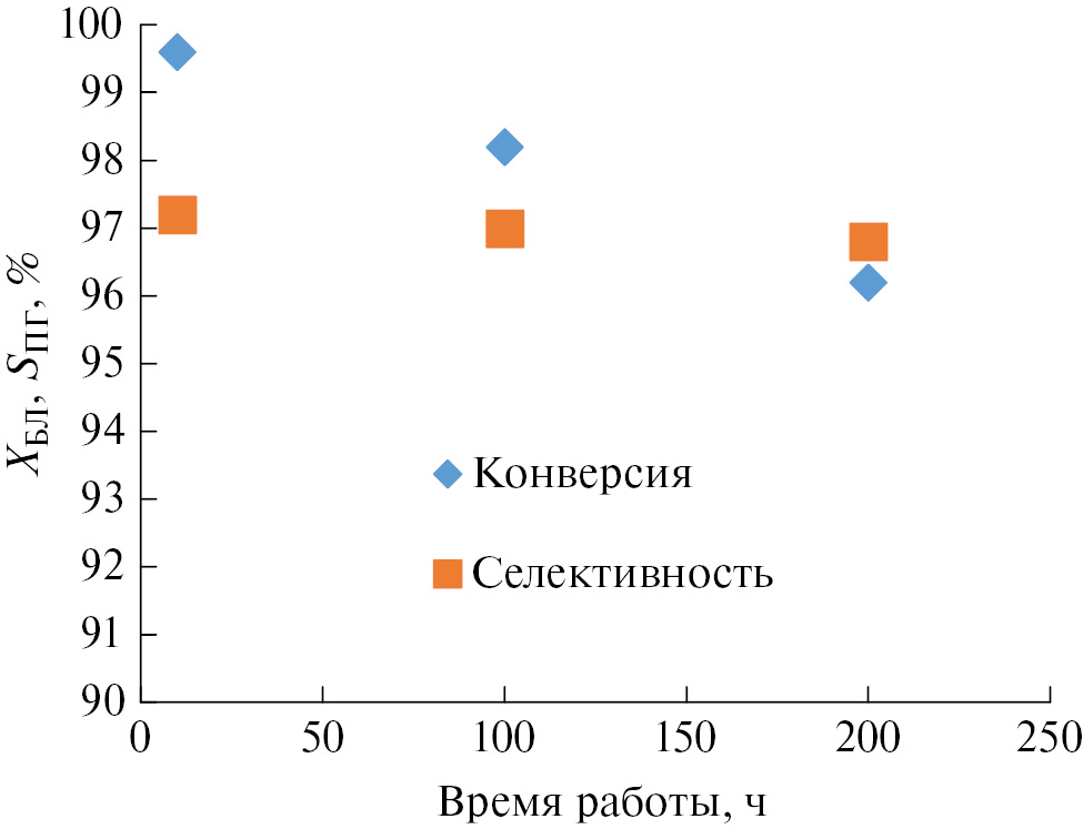 Для оценки стабильности работы катализатора был проведен эксперимент при 180°С, 10 ат, мольном соотношении Н2 : БЛ = 40, загрузке катализатора 0.4 г, условном времени пребывания τ = 0.15 г л–1 ч. Условное время пребывания (далее – время контакта) рассчитывали по формуле: