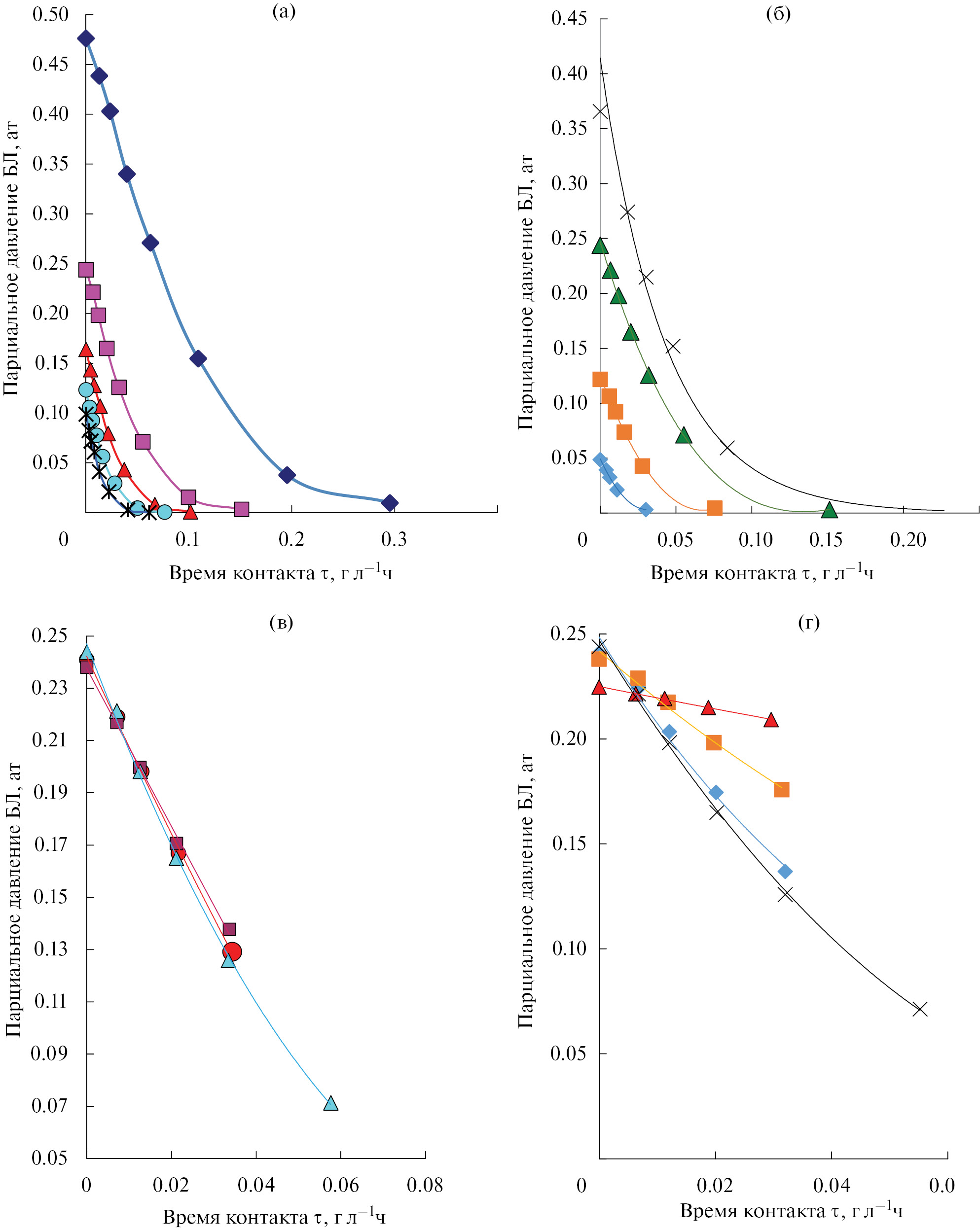 Рис. 5. Зависимость парциального давления бутиллактата (PБЛ) от времени контакта (τ) при 180°С и следующих условиях: а – общее давление 10 ат, начальное мольное соотношение водород : бутиллактат (βH2) равно 20 (♦), 40 (■), 60 (▲), 80 (●), 100 (*); б – βH2 = 40 , общее давление равно 2 (♦), 5 (■), 10 (▲), 15 (×) ат; в – общее давление 10 ат, βH2 = 40 моль/моль, начальное мольное соотношение бутанол : бутиллактат (βBuOH) равно 0 (▲), 0.5 (●), 1.0 (■); г – общее давление 10 ат, βH2 = 40, начальное мольное соотношение пропиленгликоль : бутиллактат (βПГ) равно 0 (×), 0.5 (♦), 1.0 (■), 3.5 (▲)