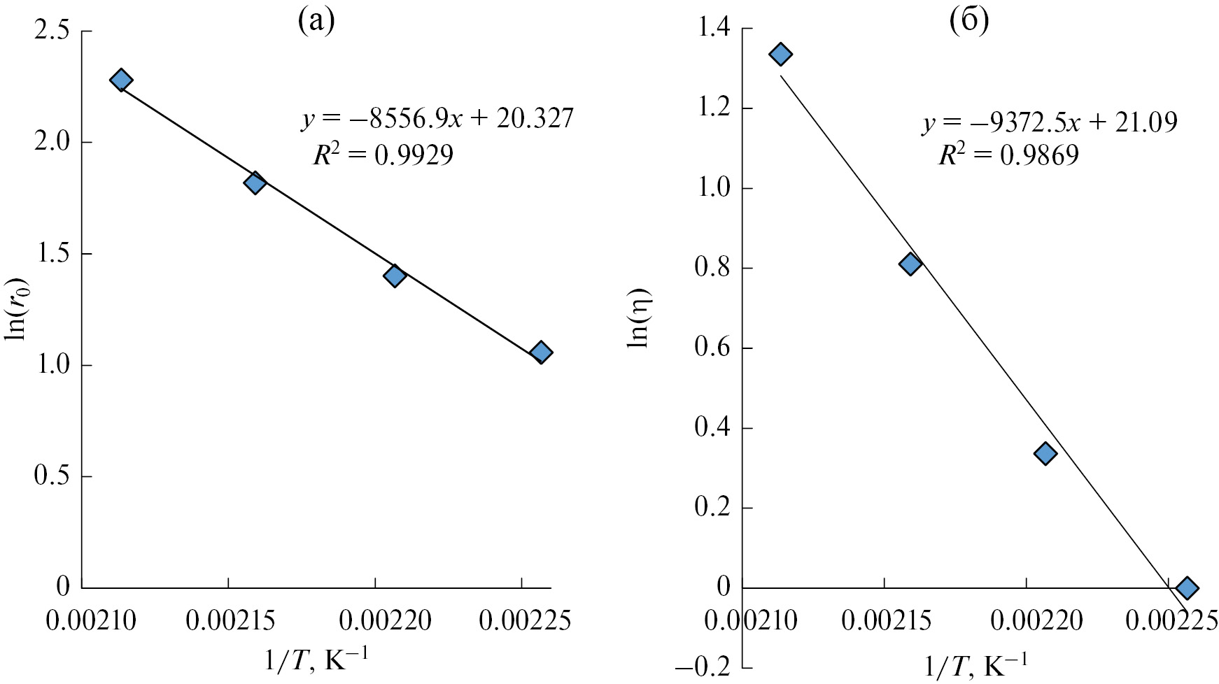 Рис. 10. Температурная зависимость начальной скорости реакции (а) и коэффициента трансформации (б) в линейных координатах уравнения Аррениуса