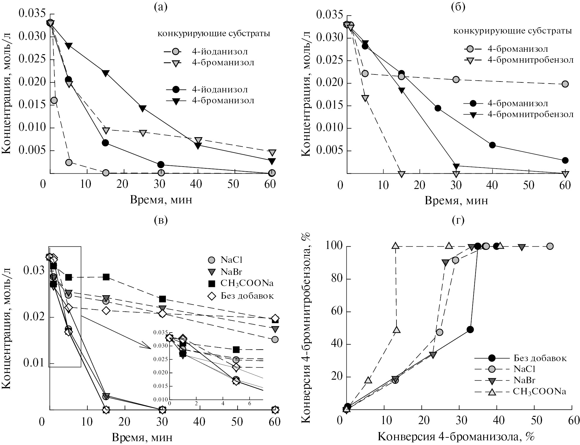 Из вида кинетических кривых, приведенных на рис. 5а, следует, что в условиях конкурирующих субстратов после полного исчерпания 4-иоданизола происходит замедление конверсии 4-броманизола, которое в целом характерно для экспериментов с его участием (рис. 4). В отличие от случая, описанного в работе [17], ускорения конверсии менее активного субстрата (4-броманизола) не наблюдалось. Больше того, когда в качестве конкурирующих субстратов используются два арилбромида (4-броманизол и 4-бромнитробензол), после достижения 100% конверсии более активного 4-бромнитробензола происходит практически полная остановка конверсии 4-броманизола (рис. 5б), хотя в начальный момент времени, как и в опытах с 4-иоданизолом, оба субстрата взаимно ускоряют конверсию друг друга. Соответствующая фазовая траектория в координатах “конверсия 4-бромнитробензола–конверсия 4-броманизола” до момента остановки реакции имеет вид прямой (рис. 5г).