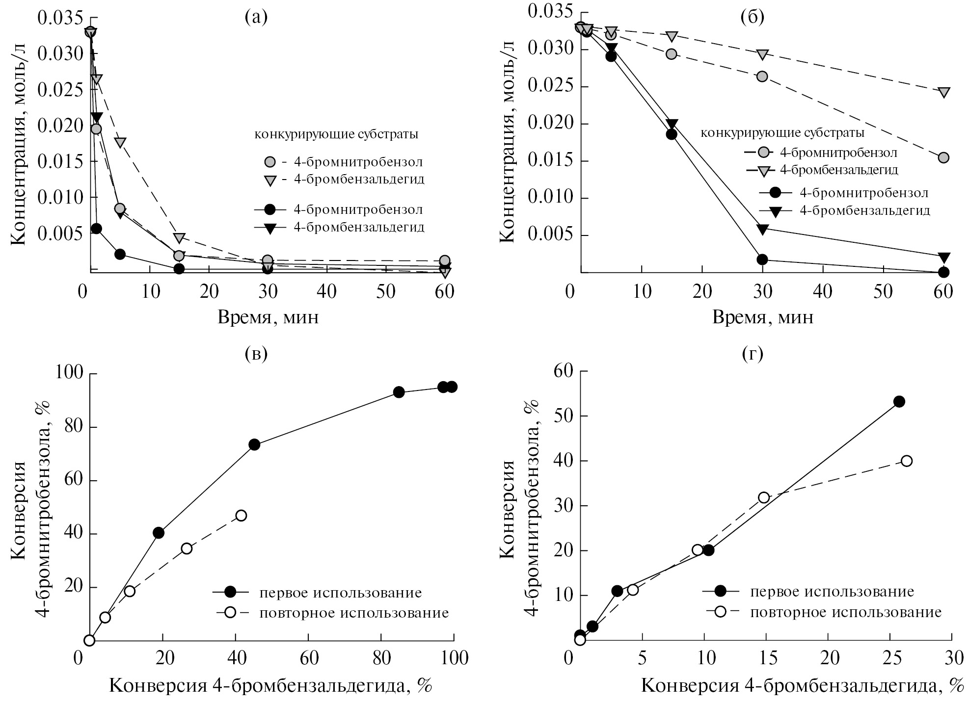 Очевидно, что при использовании 1% Pd/SНФ и 4-бромнитробензол, и 4-бромбензальдегид проявляют высокую активность в реакции кросс-сочетания с фенилбороновой кислотой: W составляет 884 моль4-бромнитробензола мольPd-1 мин-1 и 377 моль4-бромбензальдегида мольPd-1 мин-1. В присутствии конкурирующих субстратов происходит снижение начальной скорости реакции (рис. 6а) до 429 моль4-бромнитробензола мольPd-1 мин-1 и 208 моль4-бромбензальдегида мольPd-1 мин-1 соответственно. В случае восстановленного катализатора 1% Pd/SНФ-R для обоих арилбромидов наблюдается наличие небольшого индукционного периода на кинетических кривых зависимости конверсии от времени (рис. 6б). Эффект торможения реакции заметно усиливается в условиях конкурирующих субстратов: активность снижается для 4-бромнитробензола с 33 до 8 моль4-бромнитробензола мольPd-1 мин-1 и для 4-бромбензальдегида с 32 до 4 моль4-бромбензальдегида мольPd-1 мин-1.
