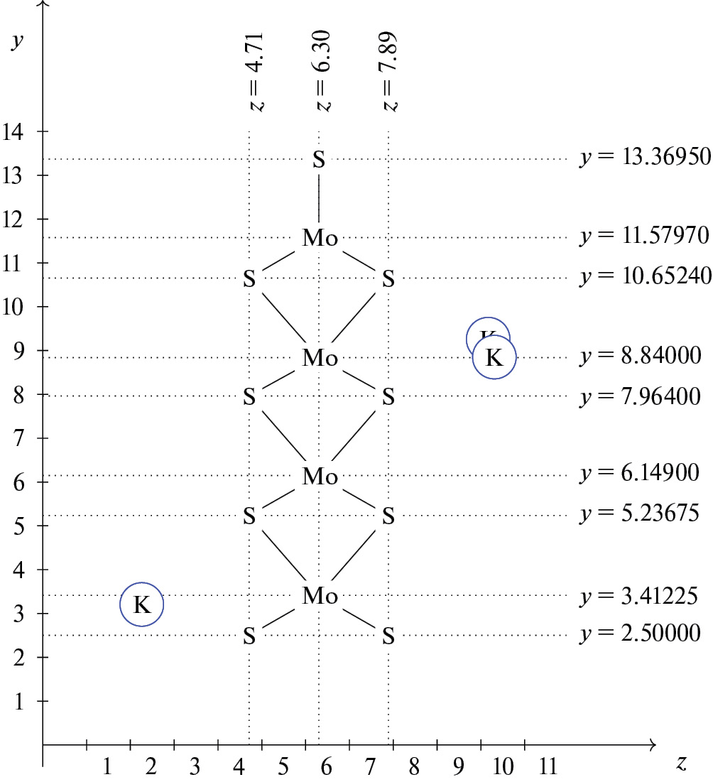 Исходя из этих требований, модельная ячейка построена следующим образом. Лента дисульфида молибдена из четырех рядов атомов вписана в ячейку размером 18.06 × 25.0 × 12.6 Å (6 атомов металла вдоль ребра). Моделировалось M-ребро. Атомы двух рядов, удаленных от М-ребра, были зафиксированы. Положение остальных атомов оптимизировалось. На ребре построен модельный центр из двух атомов молибдена и двух атомов кобальта (рис. 1, 2). Пара атомов молибдена содержит “качающийся” сульфидный мостик, и с его стороны для изоляции активного центра от его образа в “соседней” суперячейке был поставлен дополнительный атом кобальта. Для изоляции со стороны пары атомов кобальта использовался атом молибдена с терминальным сульфидом. Атомы молибдена и серы с y < 7 были зафиксированы, остальные атомы “отпущены”. Внесенные дополнительные атомы калия на боковой поверхности находятся в виде катионов, а новая электронная плотность находится на модельной ленте и концентрируется на активном центре [8]. Ионы калия связаны с модельной лентой ненаправленными кулоновскими силами и могут мигрировать в сторону отрицательного заряда. На рис. 1, 2 показано “стартовое” положение атомов металла и серы и “равновесное” положение атомов калия.