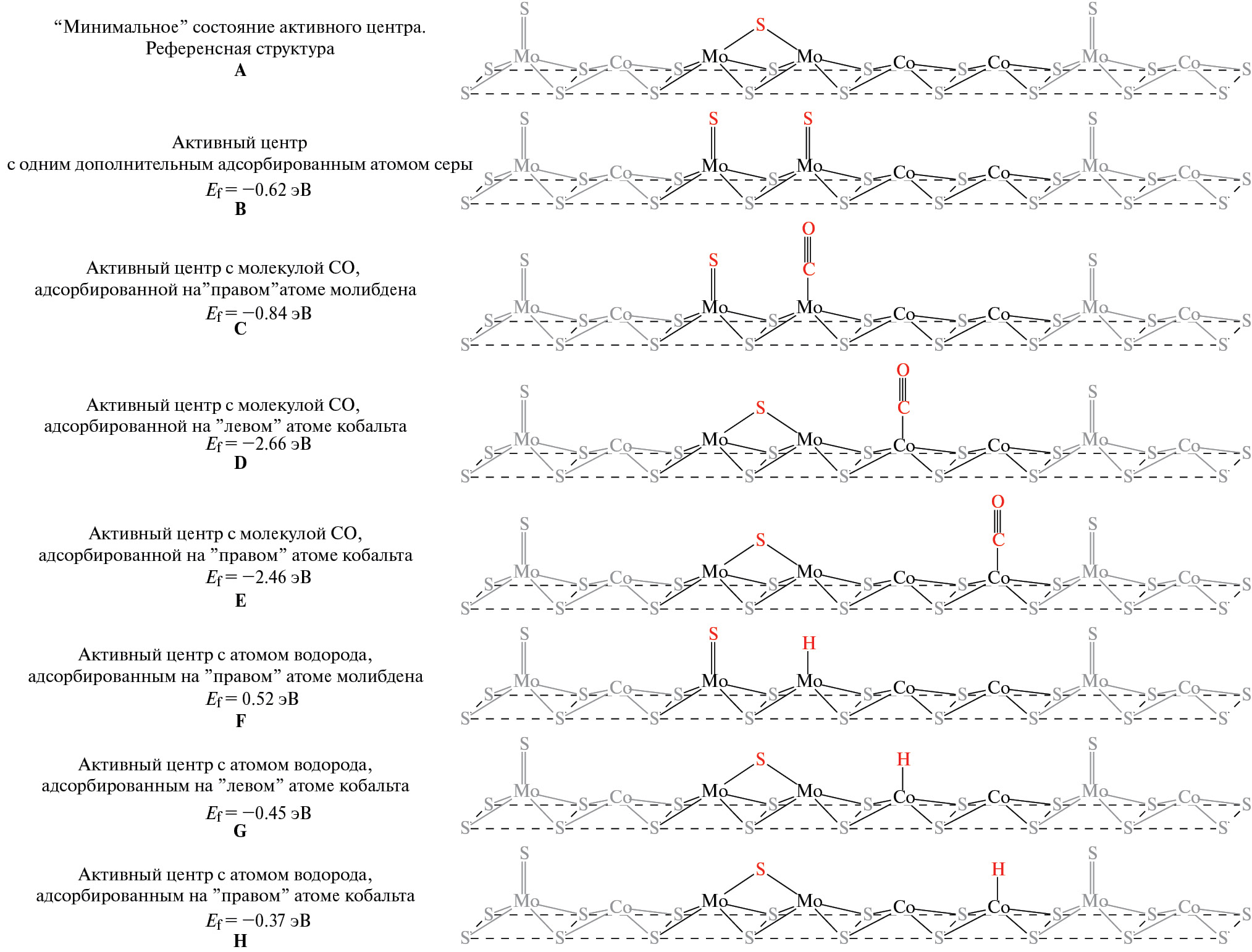 Для первичной оценки свойств активного центра был проведен расчет структур с адсорбцией CO и атомарного водорода в разных позициях. На рис. 3 приведены референсная структура (A) и структуры с адсорбатами (B–H). Структуры B, С и F демонстрирует предполагаемую роль “качающегося” мостика: атом серы такого мостика способен “открывать” оксофильную координационную вакансию на атоме молибдена, однако это происходит с существенными затратами энергии.