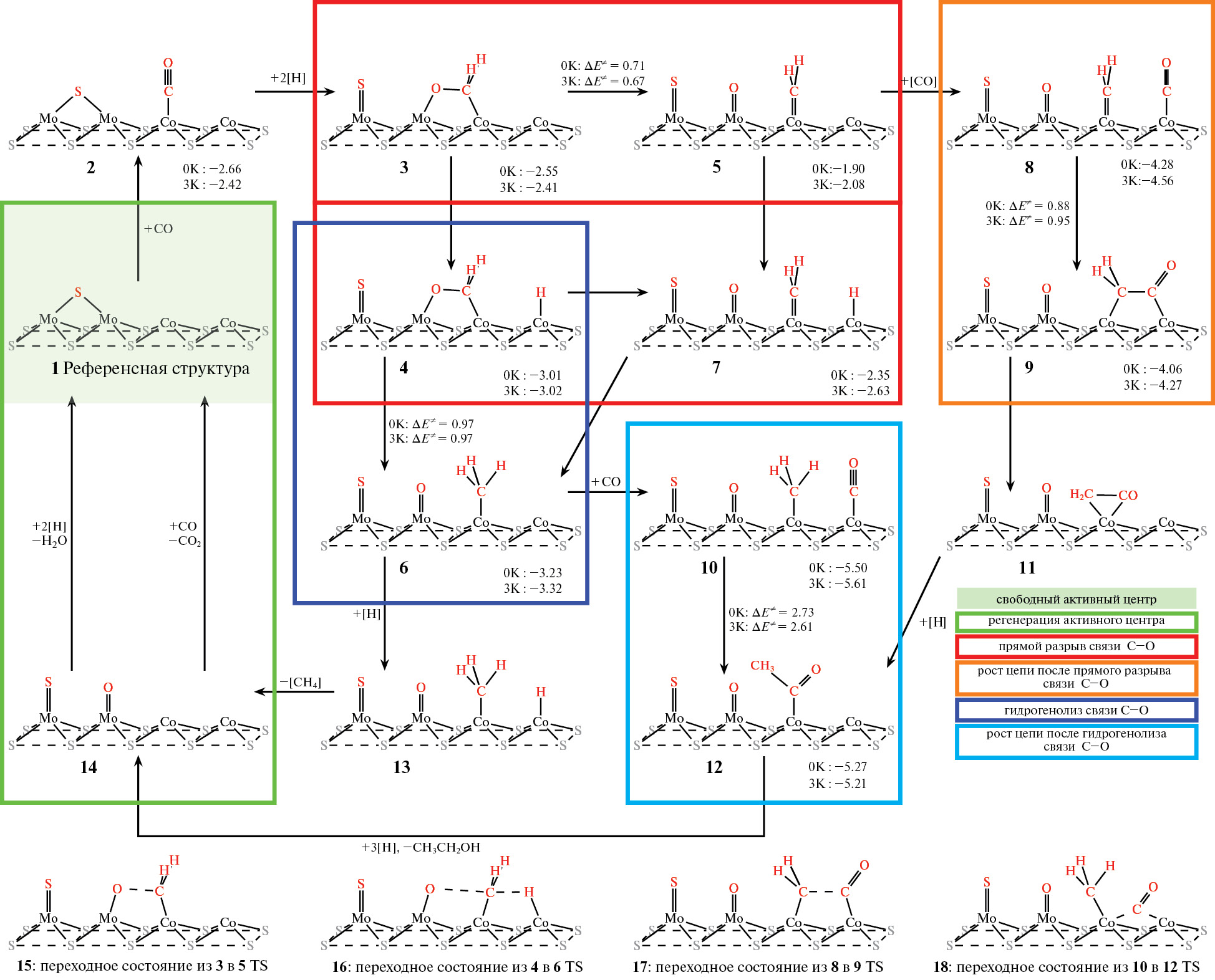 Образующийся после десорбции углеродсодержащего продукта оксигенированный центр может регенерировать по одному из двух механизмов: с участием водорода (и десорбций воды) и с участием CO (и десорбций CO2). Результатом является десорбция конечных продуктов и регенерация исходного состояния. Рассчитанная энергия образования метана из синтез-газа составляет –3.48 эВ, а этанола – –5.14 эВ или –2.57 эВ в пересчете на один атом углерода (в предположении связывания избыточного кислорода в воду). Таким образом, образование метана в условиях синтеза спиртов энергетически более выгодно, и сдвиг селективности в сторону этанола при добавлении калия к молибденсульфидным катализаторам определяется кинетическими факторами. В первую очередь это некоторая стабилизация метиленового интермедиата, что означает снижение энергии переходного состояния в дальнейшем внедрении CO, несмотря на незначительный рост барьера этого шага. Добавление калия понижает энергию активации внедрения CO в связь металл–метил на 0.12 эВ. Однако эта энергия все равно остается очень высокой (~2.6 эВ). Введение калия в модель также стабилизирует частицы, ковалентно связанные с активным центром (гидрид, метил, метилен и др.), и дестабилизирует дативно связанные частицы (CO, H2O). Калий способствует десорбции продуктов и предотвращает блокирование активного центра избыточным CO.