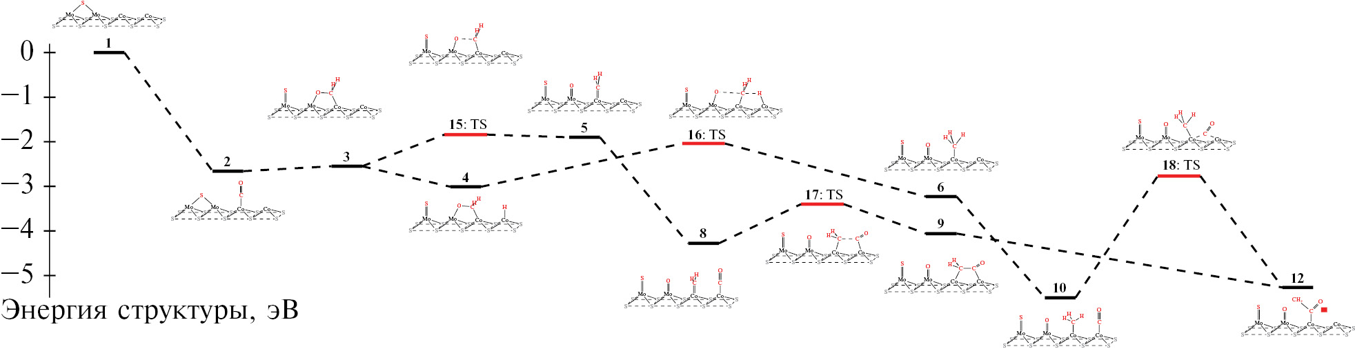Далее CO гидрируется до альдегидоподобного интермедиата 3. Этот процесс не моделировали, гидрирующая активность молибденсульфидных катализаторов хорошо известна. Альдегидподобный интермедиат адсорбирован кислородом на атоме молибдена и углеродом на атоме кобальта. Энергия структуры с адсорбцией углеродом на атоме молибдена на ~1 эВ выше для структуры без калия. Мы рассматриваем это как проявление высокой оксофильности атома молибдена, которая должна облегчить разрыв связи C–O.