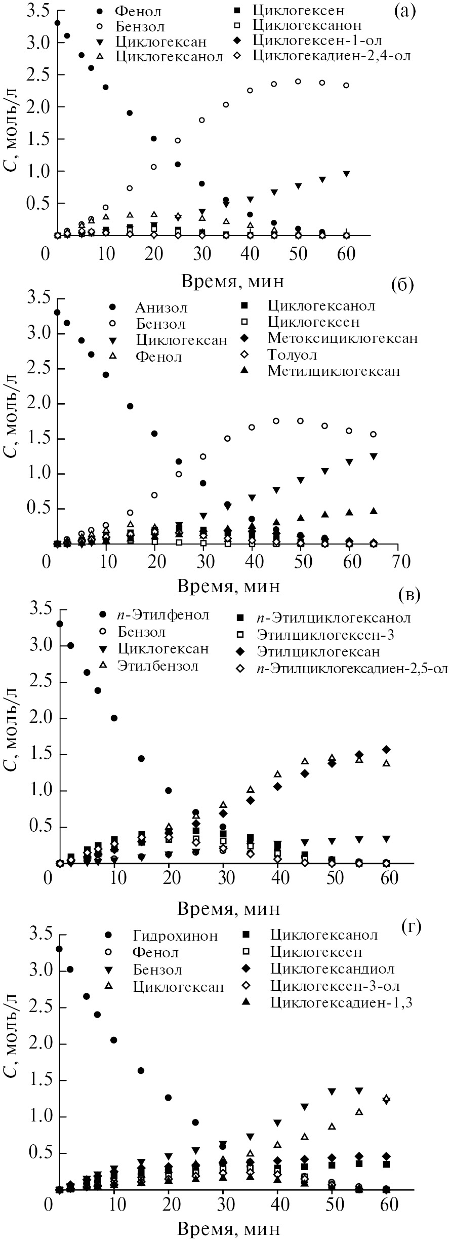 Рис. 1. Кинетические кривые расходования субстратов и накопления продуктов при конверсии фенола (а), анизола (б), п-этилфенола (в) и гидрохинона (г) в присутствии катализатора Ni–Ru/SiO2@HPS. Условия процесса: температура – 280°С, соотношение субстрата к катализатору – 10 моль субстрата/г металла, парциальное давление водорода – 3.0 МПа