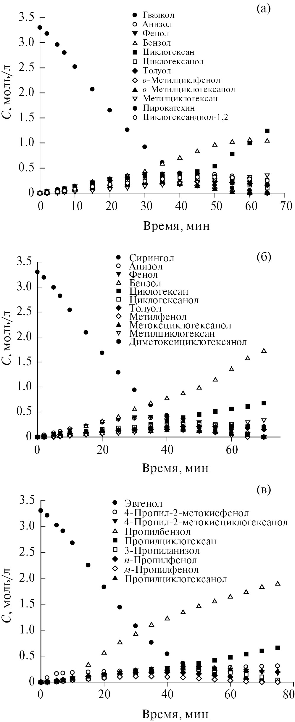 Эвгенол (рис. 2в) на первых минутах подвергается гидрированию с появлением 4-пропил-2-метокси-фенола. Дальнейшими реакциями являются деоксигенация или деметоксилирование, а также гидрирование ароматического кольца с образованием 3-пропилметоксибензола, п- и м-пропилфенола и 4-пропил-2-метоксициклогексанола соответственно. По истечении 70 мин в реакционной смеси присутствуют пропилбензол, пропилциклогексан, пропилциклогексанол. Финальный продукт превращения эвгенола – пропилциклогексан. Также нужно отметить образование гваякола, анизола и фенола в незначительных количествах, что указывает на возможное деалкилирование эвгенола.