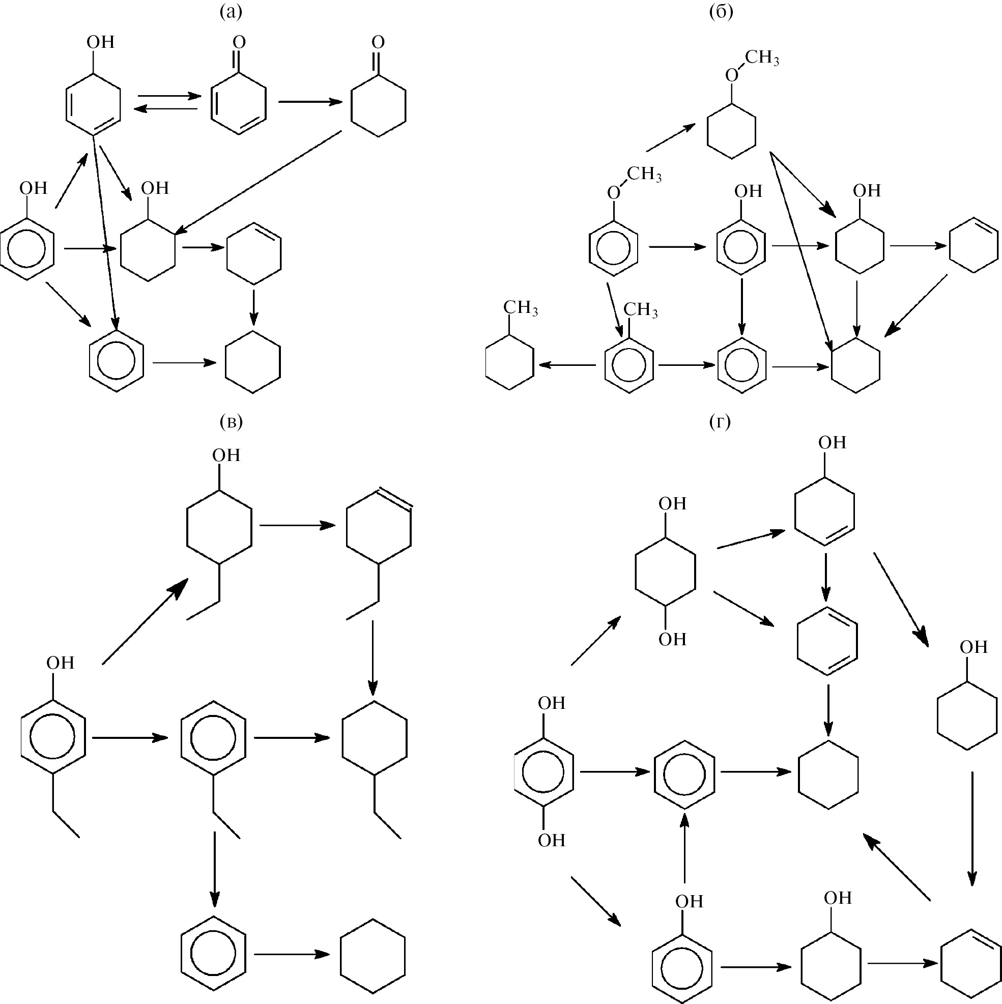 Схема 1. Пути превращения мономеров деполимеризации лигнина: фенола (а), анизола (б), п-этилфенола (в) и гидрохинона (г)